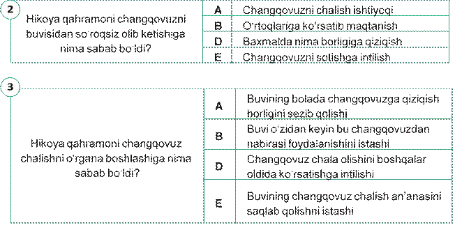 3. Nevarasi changqovuzni so‘roqsiz olganidan buvining jahli chiqdi.