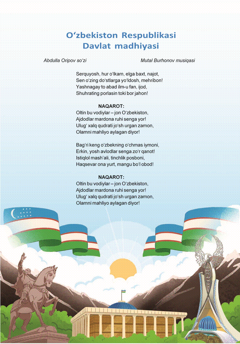Inson uchun havo, quyosh, suv, non, ota-ona qanchalik aziz va muqaddas bo‘lsa, Vatan ham shunchalik mo‘tabardir. Vatan ona tuproqdan boshlanadi. Vatanga muhabbat shu tuproqqa – ona qishloq dalalariga, ko‘klam chog‘ida lolazorga aylanadigan qiradirlarga, olislarda yuksalgan moviy tog‘larga, hatto yantog‘-u saksovuldan boshqa giyoh unmaydigan dasht-u sahrolarga muhabbatdan boshlanadi.