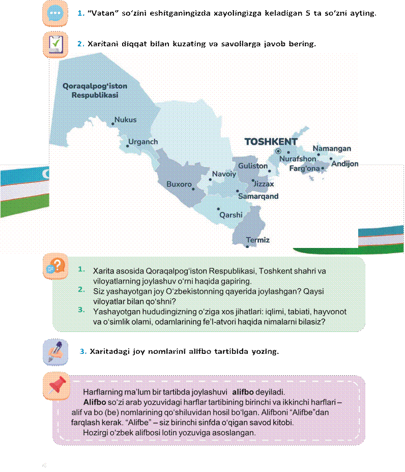 5. Jadvalda yurtimizdagi joy nomlari keltirilgan. Bo‘sh o‘rinlarni to‘ldirib, ularni ko‘chiring. Har bir so‘zning to‘g‘ri yozilishi va talaffuzini mashq