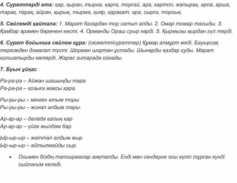4. Суреттерді ата: қар, қыран, тырна, қарға, торғай, ара, картоп, жапырақ, арпа, арша, тарақ, парақ, айран, қырық, тырма, қияр, қарақат, ара, сырға, торсық.