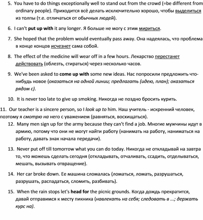 11. Our teacher is a sincere person, so I look up to him. Наш учитель - искренний человек, поэтому я смотрю на него с уважением (равняться, восхищаться).