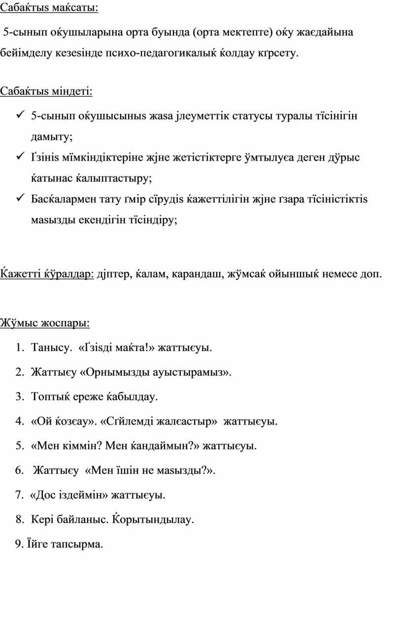 5-сынып оќушыларына орта буында (орта мектепте) оќу жаєдайына бейімделу кезеѕінде психо-педагогикалыќ ќолдау кґрсету.