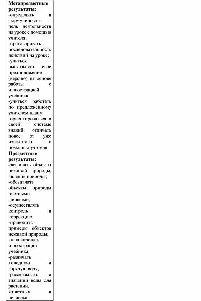 Личностные результаты: -оценивать жизненные ситуации (поступки людей) с точки зрения общепринятых норм и ценностей: в предложенных ситуациях отмечать конкретные поступки, которые можно оценить как хорошие или плохие; -самостоятельно определять и высказывать самые простые общие для всех людей правила поведения (основы общечеловеческих нравственных ценностей); -объяснять и оценивать конкретнее поступки как хорошие или плохие. Метапредметные результаты: -определять и формулировать цель деятельности на уроке с помощью учителя; -проговаривать последовательность действий на уроке; -учиться высказывать свое предположение (версию) на основе работы с иллюстрацией учебника; -учиться работать по предложенному учителем плану; -ориентироваться в своей системе знаний: отличать новое от уже известного с помощью учителя. Предметные результаты: -различать объекты неживой природы, явления природы; -обозначать объекты природы цветными фишками; -осуществлять контроль и коррекцию; -приводить примеры объектов неживой природы; анализировать иллюстрации учебника; -различать холодную и горячую воду; -рассказывать о значении воды для растений, животных и человека.