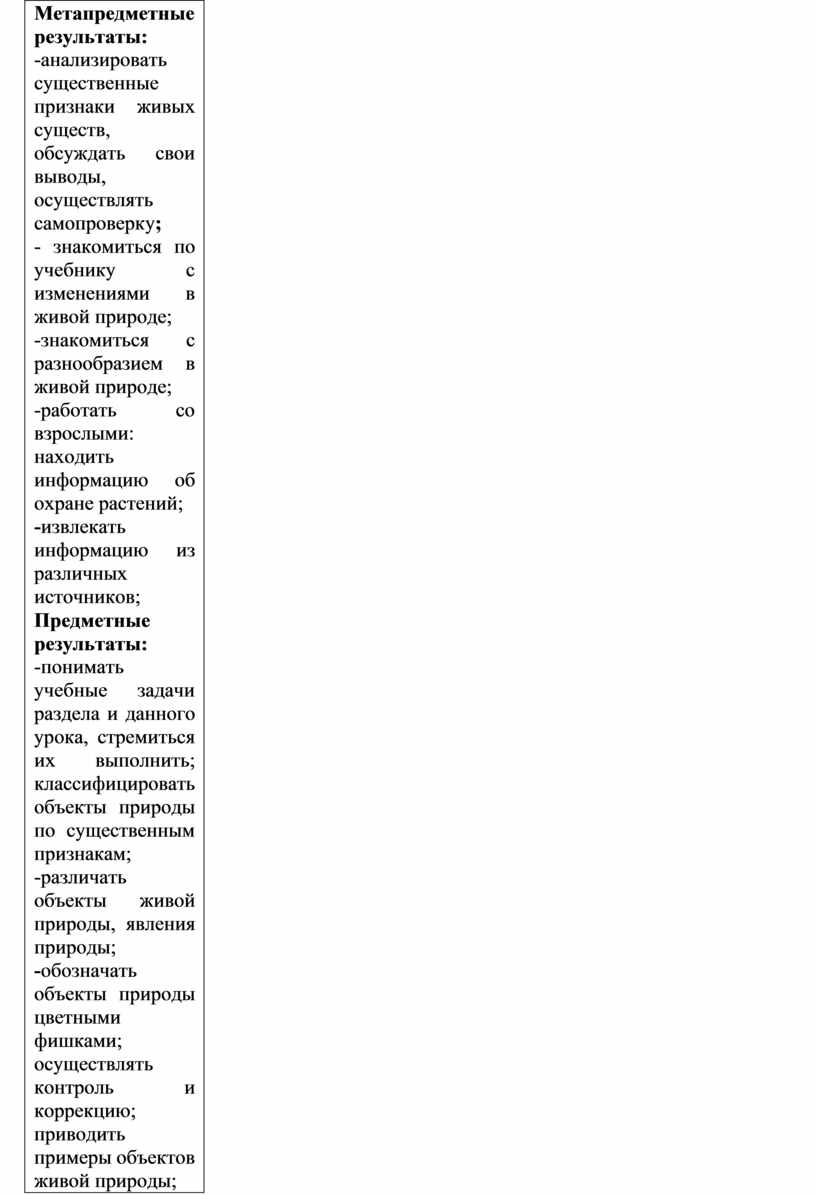 Личностные результаты: -формулировать выводы из изученного материала, отвечать на вопросы и оценивать свои достижения на уроке; -дополнять сведения учебника и экскурсии своими наблюдениями; -обозначать соответствующие рисунки цветными фишками, осуществлять контроль и коррекцию; -оценивать правильность/неправильность предложенных ответов; -оценивать бережное или потребительское отношение к природе; -формировать адекватную самооценку в соответствии с набранными баллами. Метапредметные результаты: -анализировать существенные признаки живых существ, обсуждать свои выводы, осуществлять самопроверку; - знакомиться по учебнику с изменениями в живой природе; -знакомиться с разнообразием в живой природе; -работать со взрослыми: находить информацию об охране растений; -извлекать информацию из различных источников; Предметные результаты: -понимать учебные задачи раздела и данного урока, стремиться их выполнить; классифицировать объекты природы по существенным признакам; -различать объекты живой природы, явления природы; -обозначать объекты природы цветными фишками; осуществлять контроль и коррекцию; приводить примеры объектов живой природы; -устанавливать связи между живой природой; -анализировать иллюстрации учебника; -различать фрукты и овощи; рассказывать об овощах и фруктах в питании человека; -оценивать роль комнатных растений для физического и психического здоровья человека.
