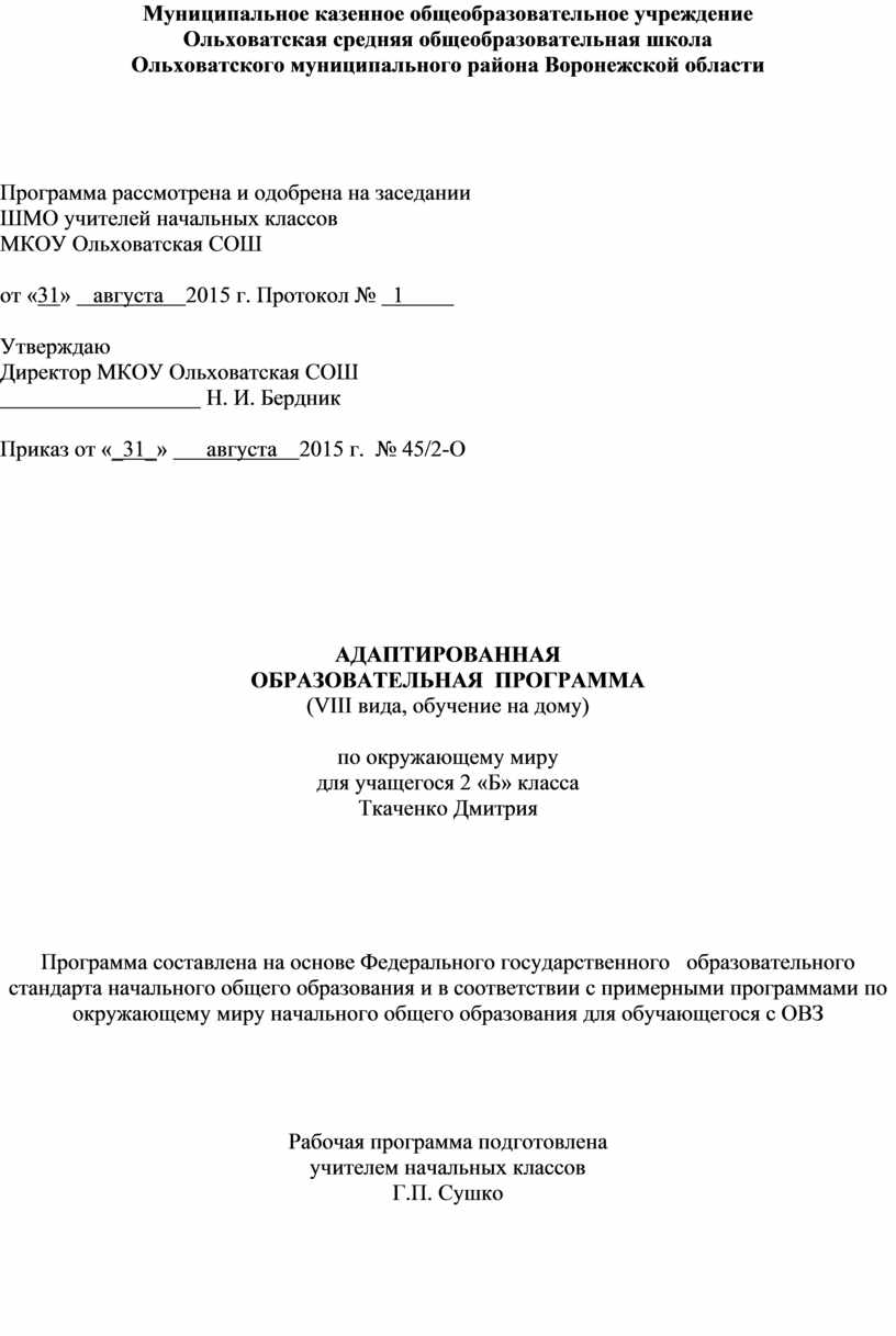 Программа составлена на основе Федерального государственного образовательного стандарта начального общего образования и в соответствии с примерными программами по окружающему миру начального общего образования для обучающегося с ОВЗ