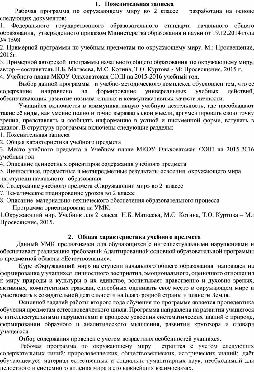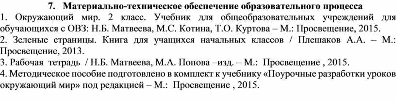 1. Окружающий мир. 2 класс. Учебник для общеобразовательных учреждений для обучающихся с ОВЗ: Н.Б. Матвеева, М.С. Котина, Т.О. Куртова – М.: Просвещение, 2015.