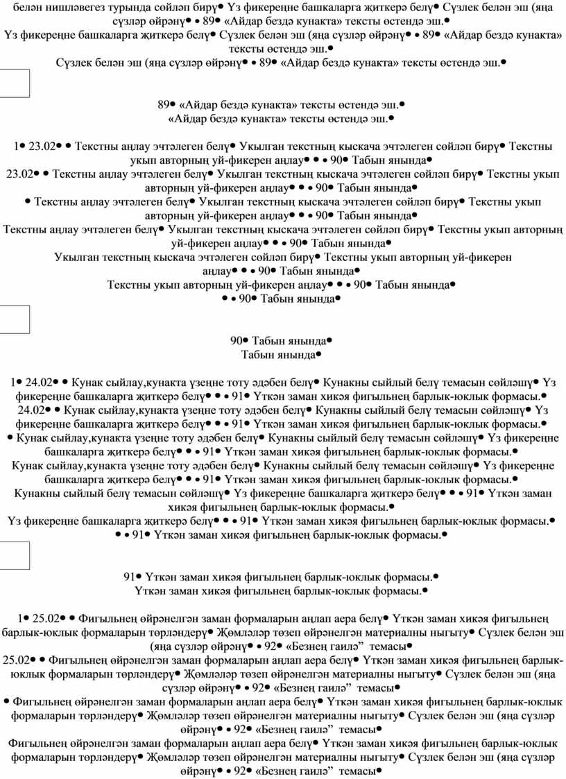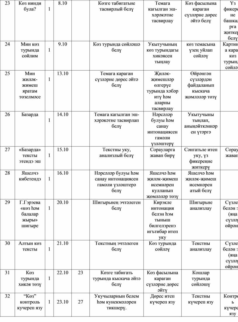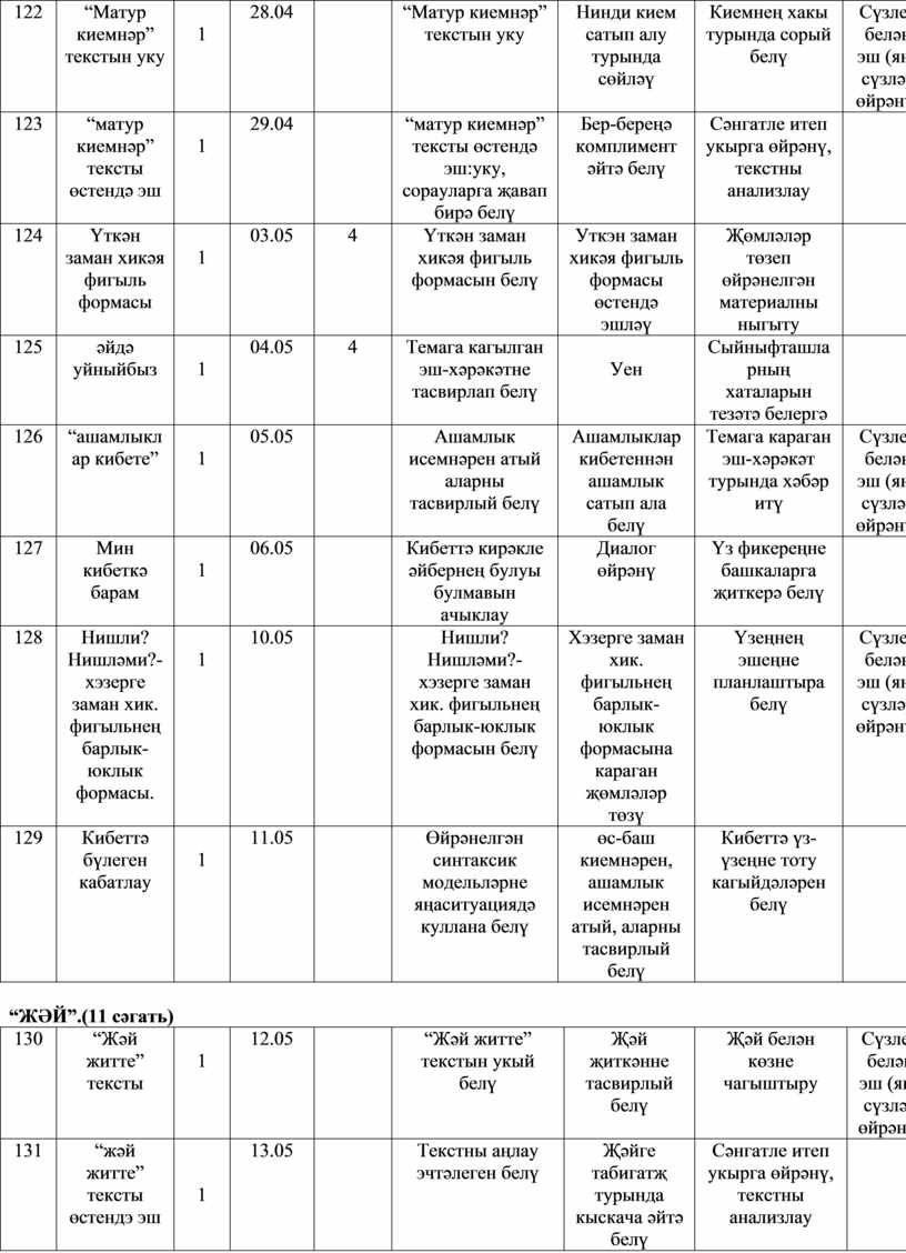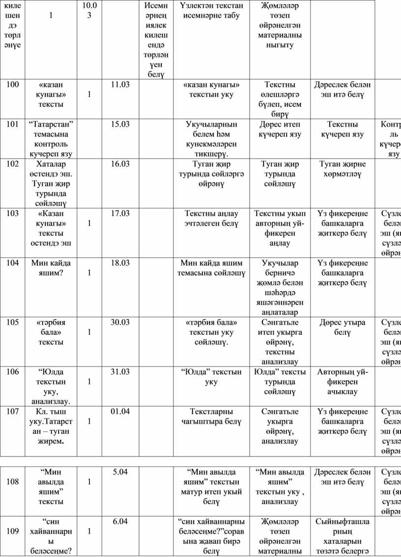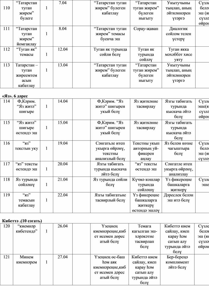 Язгы табигать, яз билгеләре, язгы урман турында текстларны аңлап уку, әңгәмәдә катнашу. Ел фасыллары турында хикәяләр уку, табышмаклар әйтү. Хикәяләр төзү. |