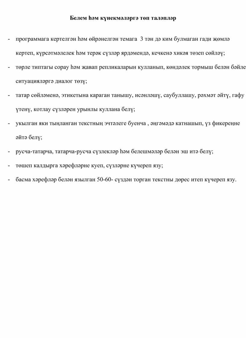 Программаның кереш өлешендә рус телле балаларга татар теле укытуның бурычлары, контроль күчереп язу өчен текстларының күләме, язма эшләрне бәяләү нормалары, белем һәм күнекмәләргә төп таләпләр күрсәтелде.