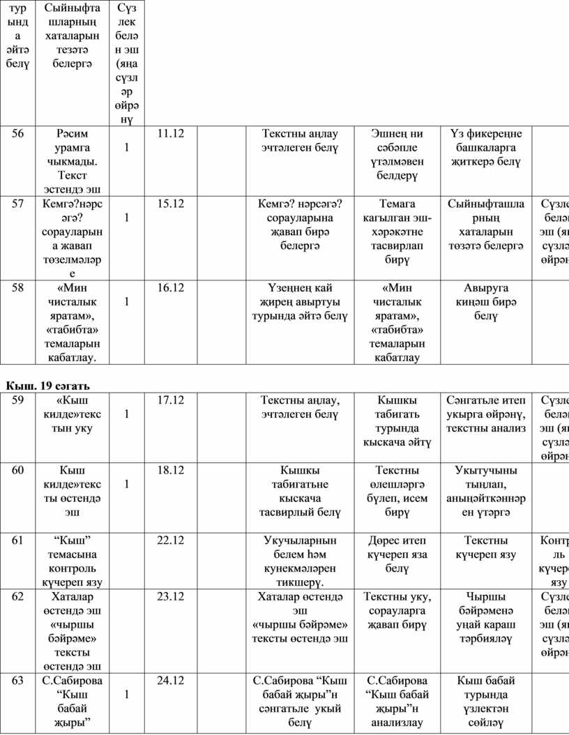 Кышкы табигать, кыш билгеләре, кышкы урман турында текстларны аңлап уку, әңгәмәдә катнашу. Ел фасыллары турында хикәяләр уку, табышмаклар әйтү. Хикәяләр төзү |