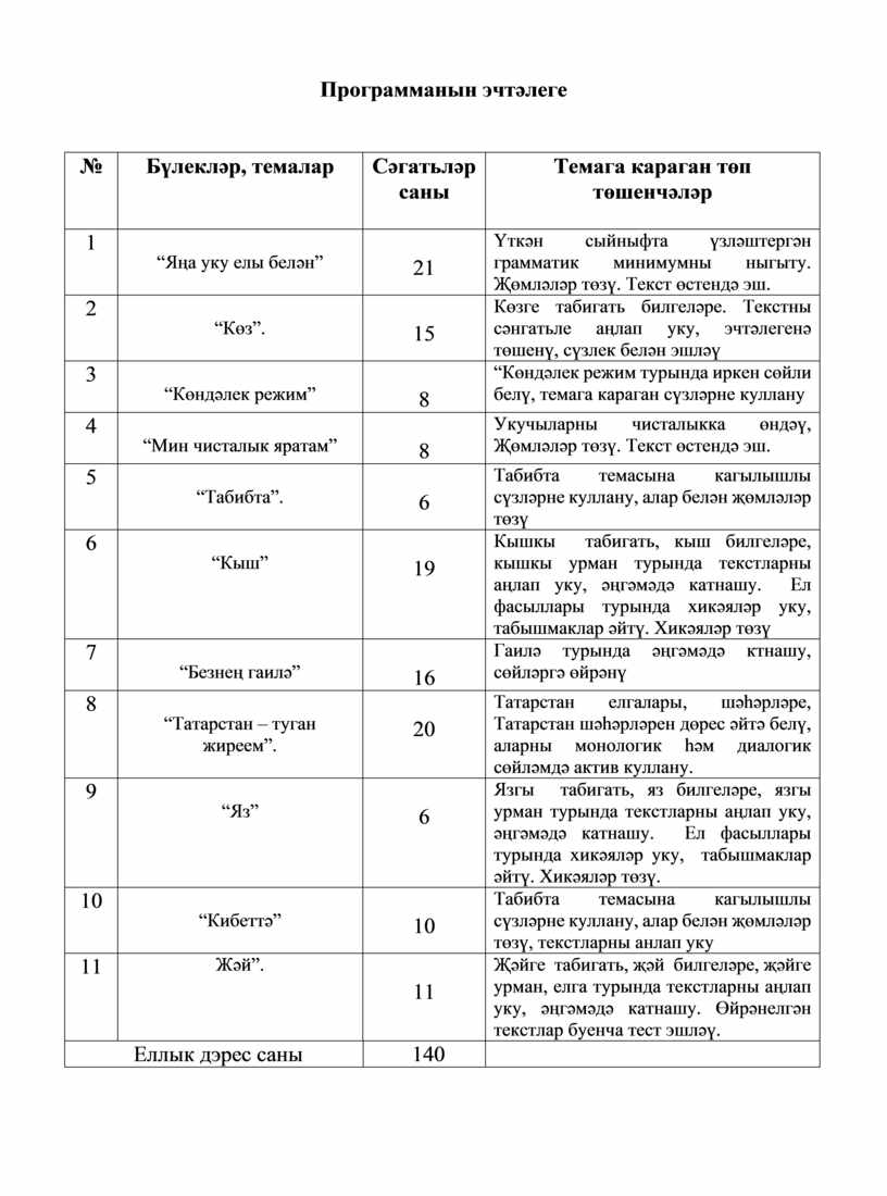 Программаның төп өлешендә балаларга татар теле өйрәтүнең коммуникатив максатлары, аралашу темалары бирелде.