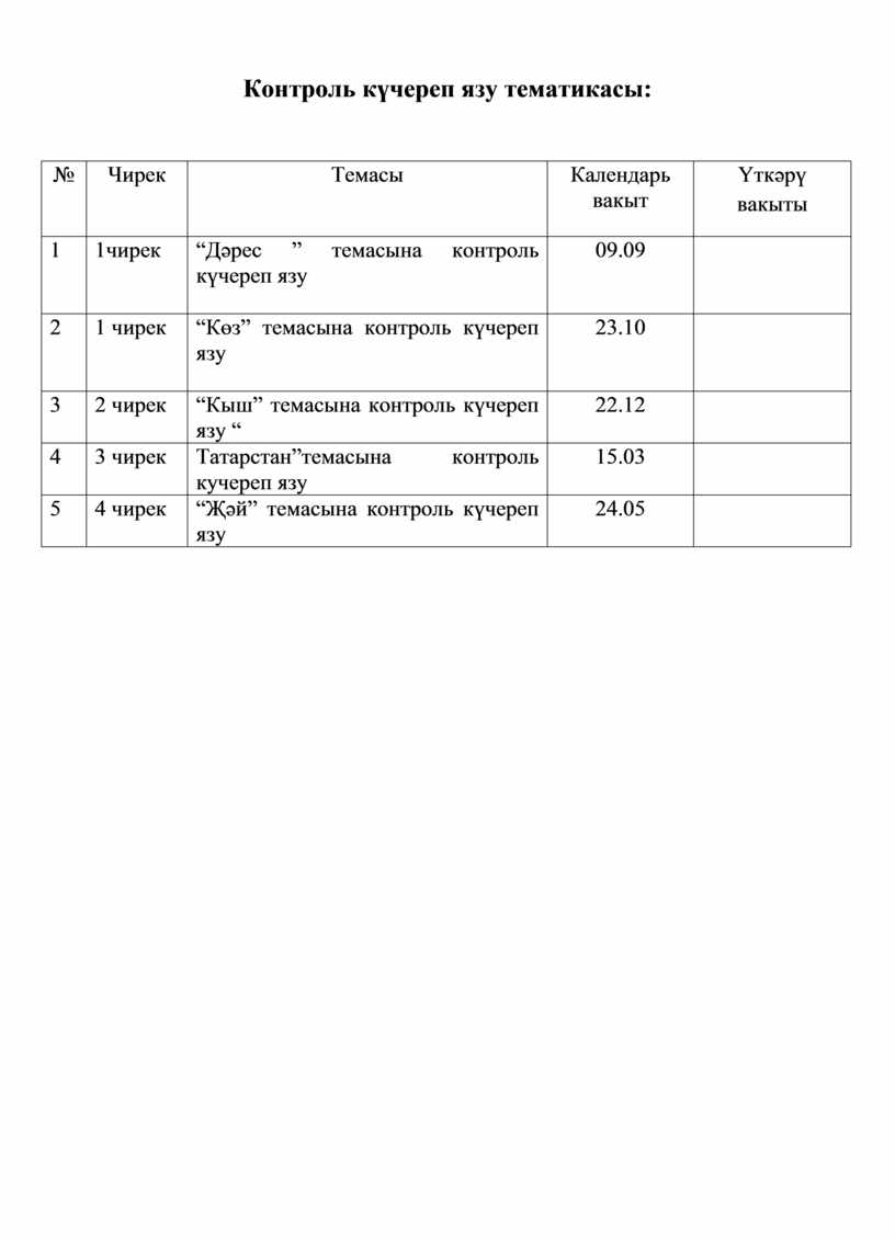 Укучыларның дөрес язу күнекмәләрен тикшерү максатыннан, уку елы башында, уку елы азагында, һәр чирек ахырында контроль күчереп язу үткәрелә.