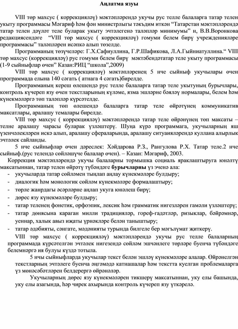 Программаның төзүчеләре: Г.Х.Сафиуллина, Г.Р.Шафикова, Л.А.Гыйниатуллина.“ VIII төр махсус (коррекцияләү) рус гомуми белем бирү мәктәбендәтатар теле укыту программасы (1-9 сыйныфлар өчен” Казан:РИЦ “школа”,2009)