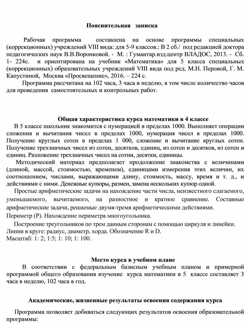 Рабочая программа составлена на основе программы специальных (коррекционных) учреждений VIII вида: для 5-9 классов.: В 2 сб./ под редакцией доктора педагогических наук В.В.Воронковой. - М. : Гумаитар.изд.центр ВЛАДОС, 2013. - Сб. 1- 224с. и ориентирована на учебник «Математика» для 5 класса специальных (коррекционных) образовательных учреждений VIII вида под ред. М.Н. Перовой, Г. М. Капустиной, Москва «Просвещение», 2016. – 224 с.