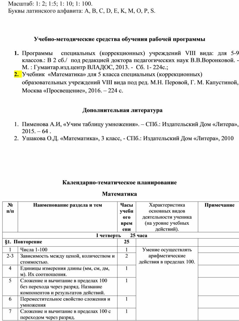 2. Учебник «Математика» для 5 класса специальных (коррекционных) образовательных учреждений VIII вида под ред. М.Н. Перовой, Г. М. Капустиной, Москва «Просвещение», 2016. – 224 с.