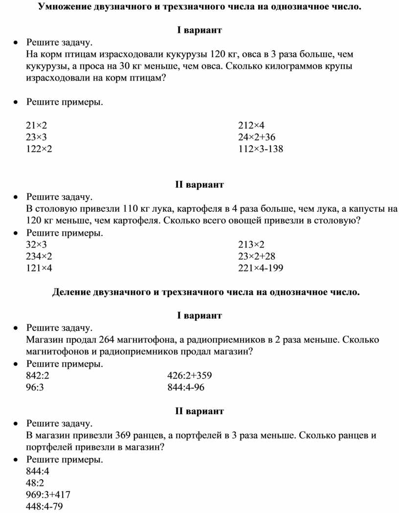 Устное умножение и деление круглых десятков, сотен на однозначное число (40 • 2; 400 • 2; 420 • 2; 40 : 2; 300 : 3; 480 : 4; 450 : 5), полных двузначных и трехзначных чисел без перехода через разряд (24 • 2; 243 • 2; 48 : 4; 488 : 4 и т. п.).