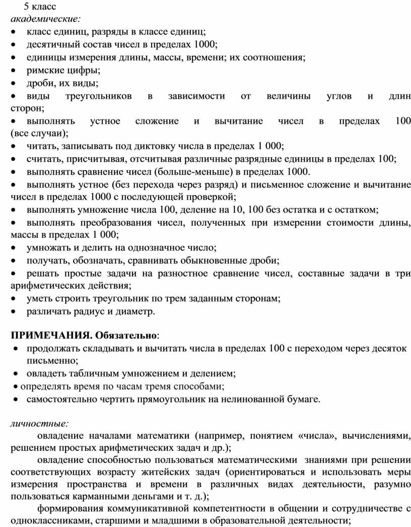 В 5 классе школьник знакомится с нумерацией в пределах 1000. Выполняет операции сложения и вычитания чисел в пределах 1000, нумерация чисел в пределах 1000. Получение круглых сотен в пределах 1 000, сложение и вычитание круглых сотен. Получение трехзначных чисел из сотен, десятков, единиц, из сотен и десятков, из сотен и единиц. Разложение трехзначных чисел на сотни, десятки, единицы.