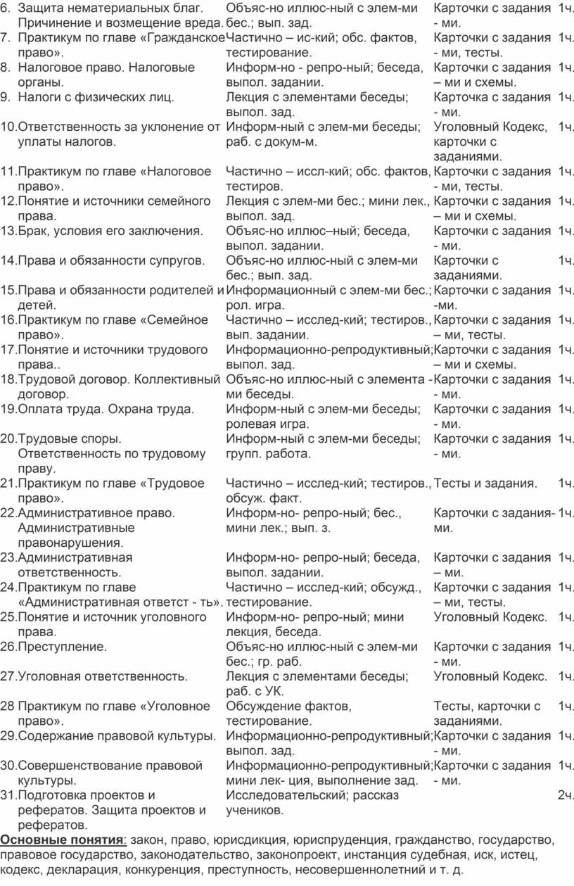 Основные понятия: закон, право, юрисдикция, юриспруденция, гражданство, государство, правовое государство, законодательство, законопроект, инстанция судебная, иск, истец, кодекс, декларация, конкуренция, преступность, несовершеннолетний и т. д.