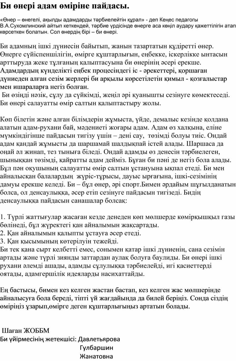 Көп білетін және алған білімдерін жұмыста, үйде, демалыс кезінде қолдана алатын адам-рухани бай, мәдениеті жоғары адам. Адам өз халқына, еліне мүмкіндігінше пайдасын тигізу үшін – дені сау, төзімді болуы тиіс. Ондай адам қандай жұмысты да шаршамай шалдықпай істей алады. Шаршаса да оңай әл жинап, тез тыныға біледі. Ондай адамды өз денесін тәрбиелеген, шыныққан төзімді, қайратты адам дейміз. Бұған би пәні де негіз бола алады. Бұл пән оқушының салауатты өмір салтын ұстануына ықпал етеді. Би мен айналысқан балалардың жүріс-тұрысы, дауыс ырғағына, ішкі-сезімінің дамуы ерекше келеді. Би – бұл өнер, әрі спорт.Бимен әрдайым шұғылданатын болса, ол денсаулыққа, әсер етіп сезінуге пайдасын тигізеді. Бидің денсаулыққа пайдасын санашалар болсақ: