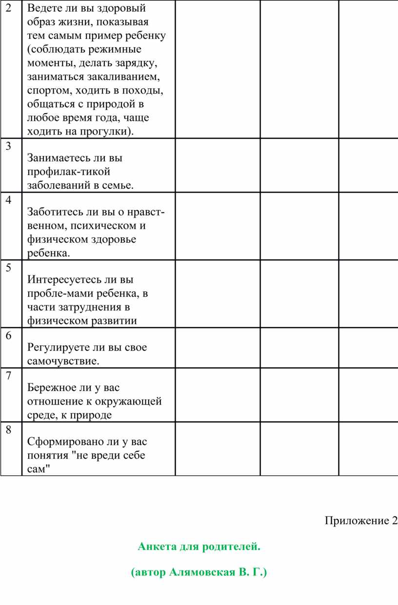 Ведете ли вы здоровый образ жизни, показывая тем самым пример ребенку (соблюдать режимные моменты, делать зарядку, заниматься закаливанием, спортом, ходить в походы, общаться с природой в любое время года, чаще ходить на прогулки). |