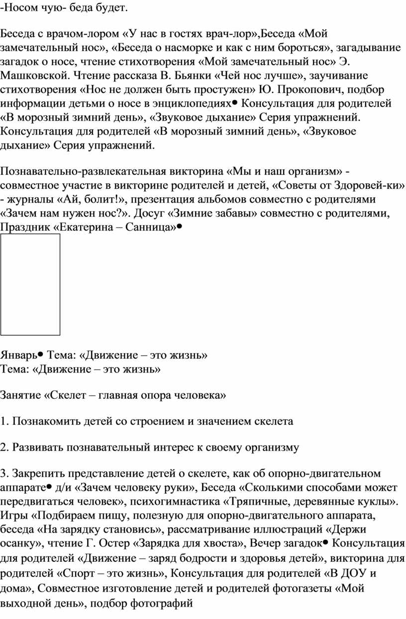 Консультация для родителей «В морозный зимний день», «Звуковое дыхание» Серия упражнений. Познавательно-развлекательная викторина «Мы и наш организм» - совместное участие в викторине родителей и детей, «Советы от Здоровей-ки» - журналы «Ай, болит!», презентация альбомов совместно с родителями «Зачем нам нужен нос?». Досуг «Зимние забавы» совместно с родителями, Праздник «Екатерина – Санница» |