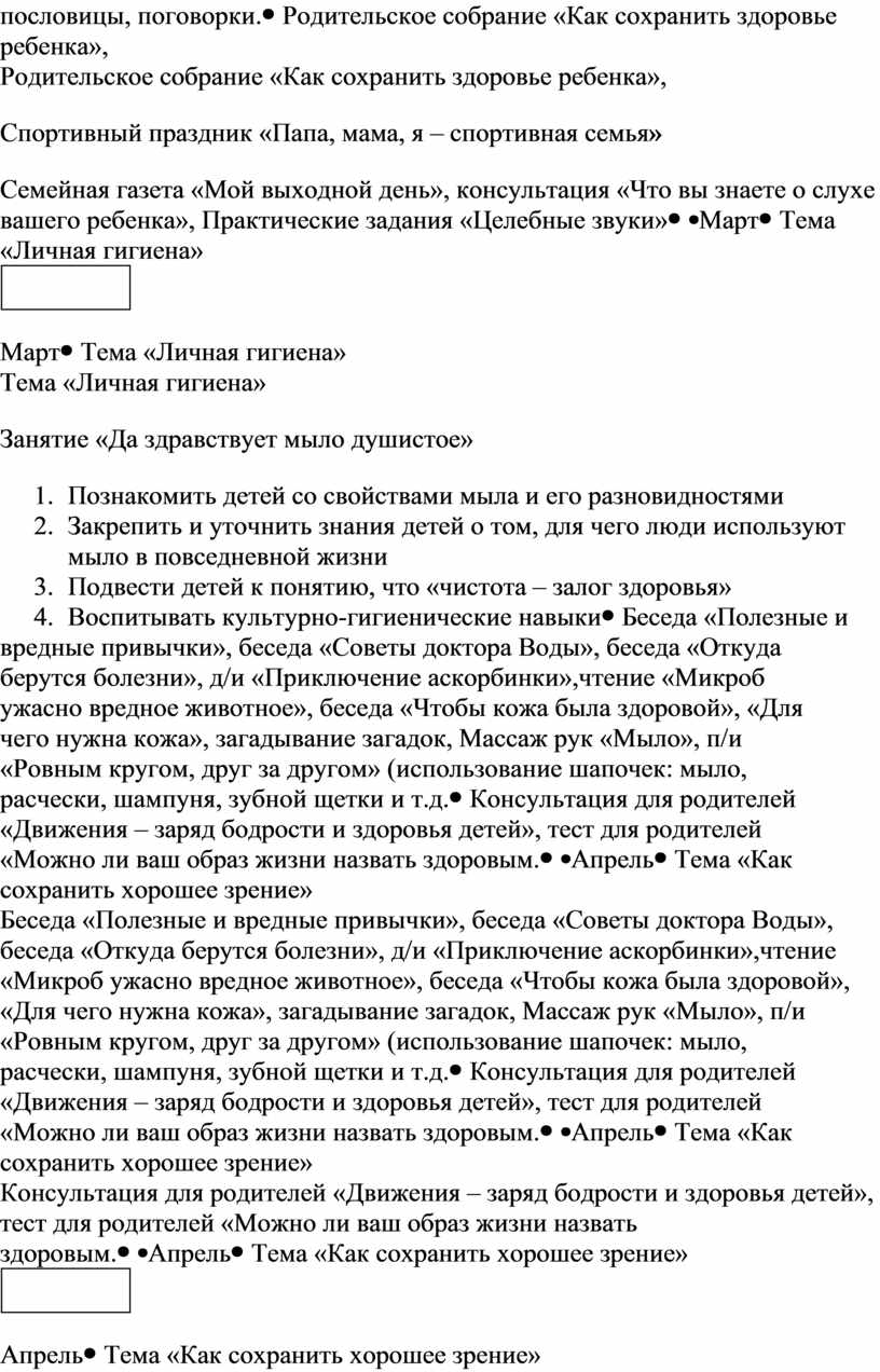 Родительское собрание «Как сохранить здоровье ребенка», Спортивный праздник «Папа, мама, я – спортивная семья» Семейная газета «Мой выходной день», консультация «Что вы знаете о слухе вашего ребенка», Практические задания «Целебные звуки» |
