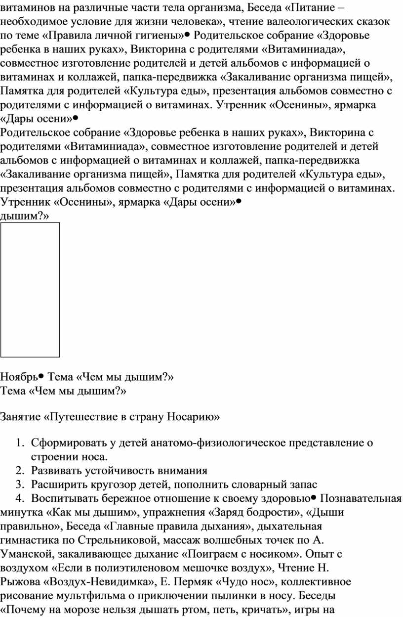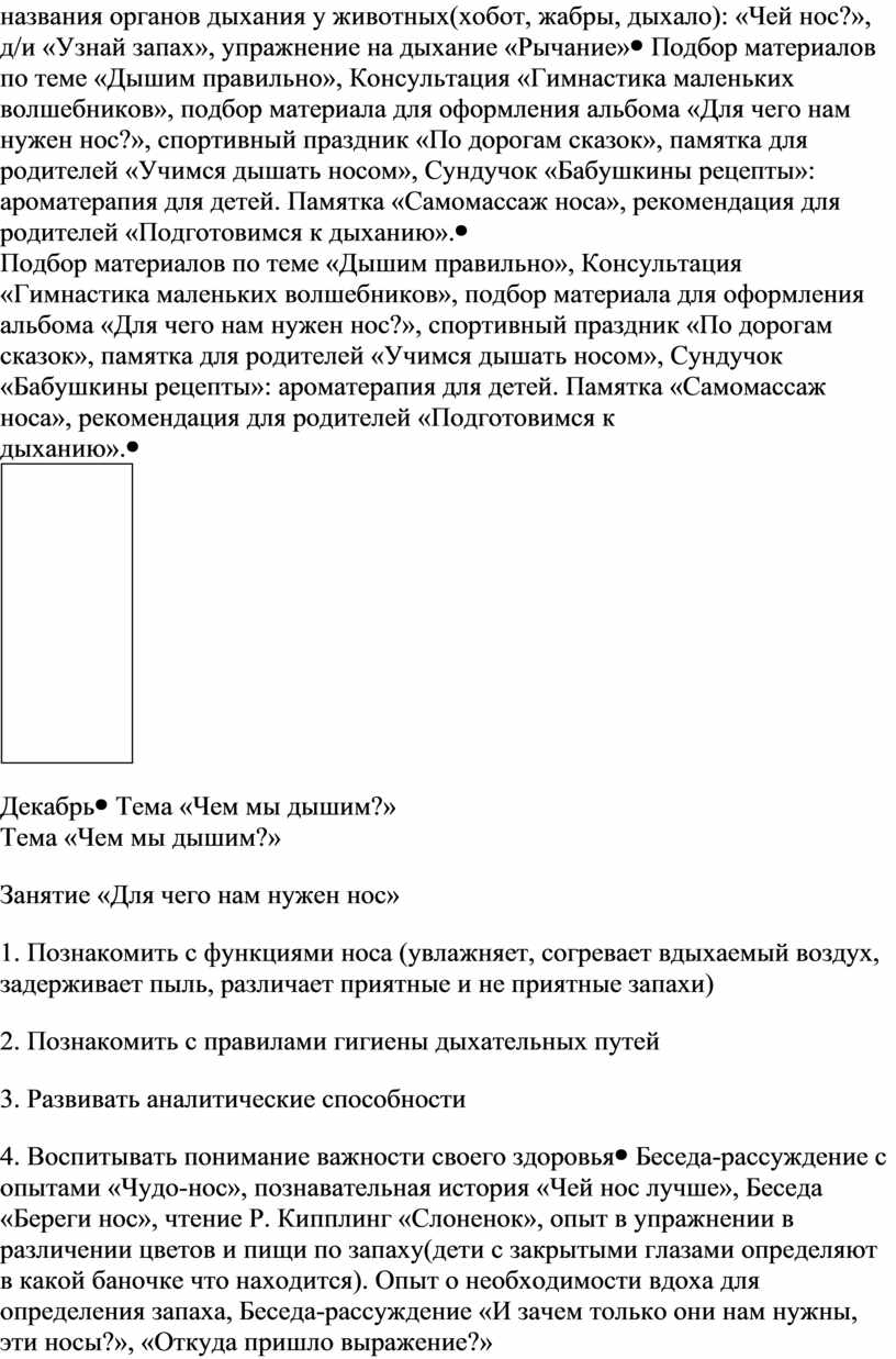 Познавательная минутка «Как мы дышим», упражнения «Заряд бодрости», «Дыши правильно», Беседа «Главные правила дыхания», дыхательная гимнастика по Стрельниковой, массаж волшебных точек по А. Уманской, закаливающее дыхание «Поиграем с носиком». Опыт с воздухом «Если в полиэтиленовом мешочке воздух», Чтение Н. Рыжова «Воздух-Невидимка», Е. Пермяк «Чудо нос», коллективное рисование мультфильма о приключении пылинки в носу. Беседы «Почему на морозе нельзя дышать ртом, петь, кричать», игры на закрепление названия органов дыхания у животных(хобот, жабры, дыхало): «Чей нос?», д/и «Узнай запах», упражнение на дыхание «Рычание» |