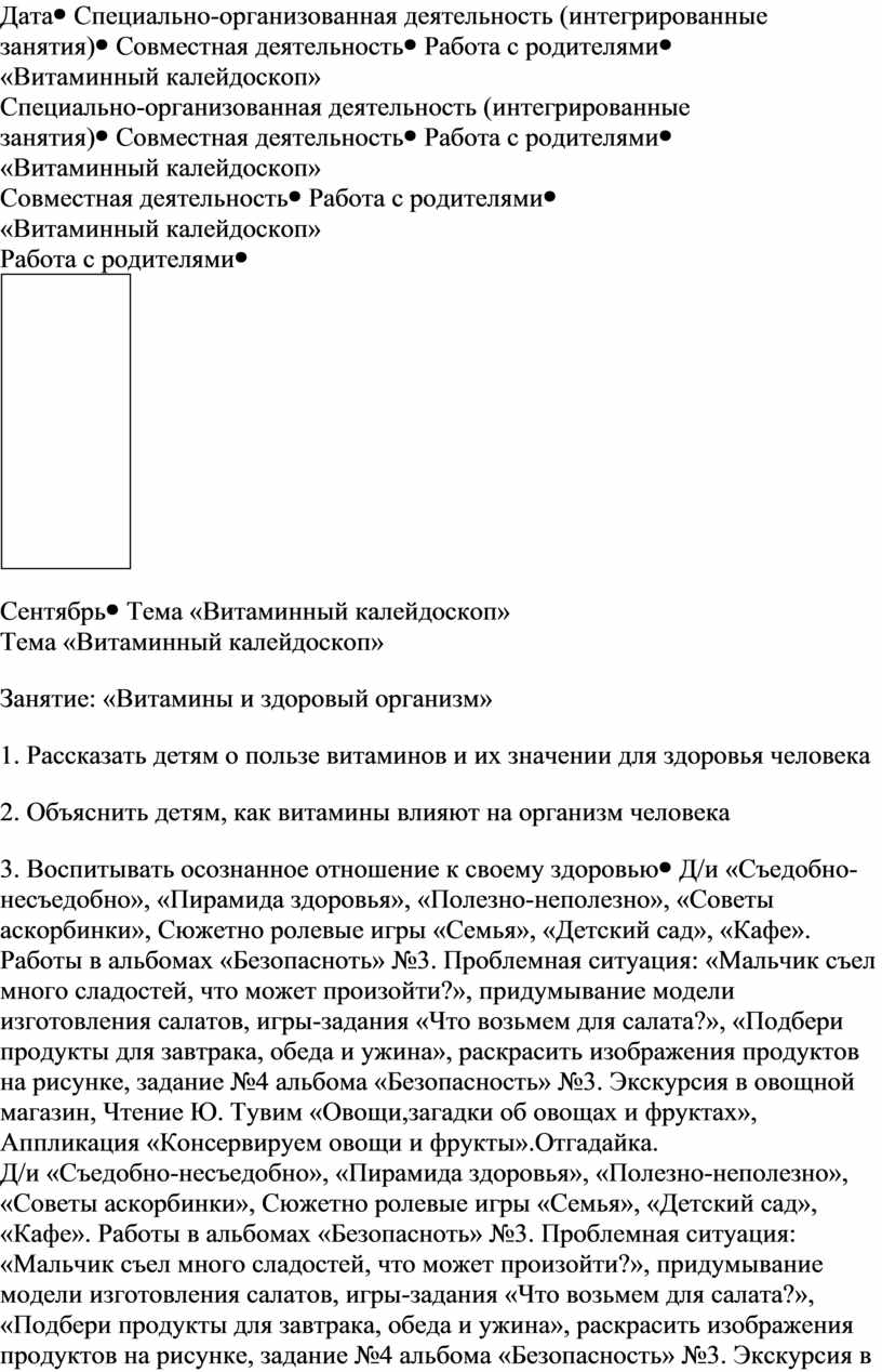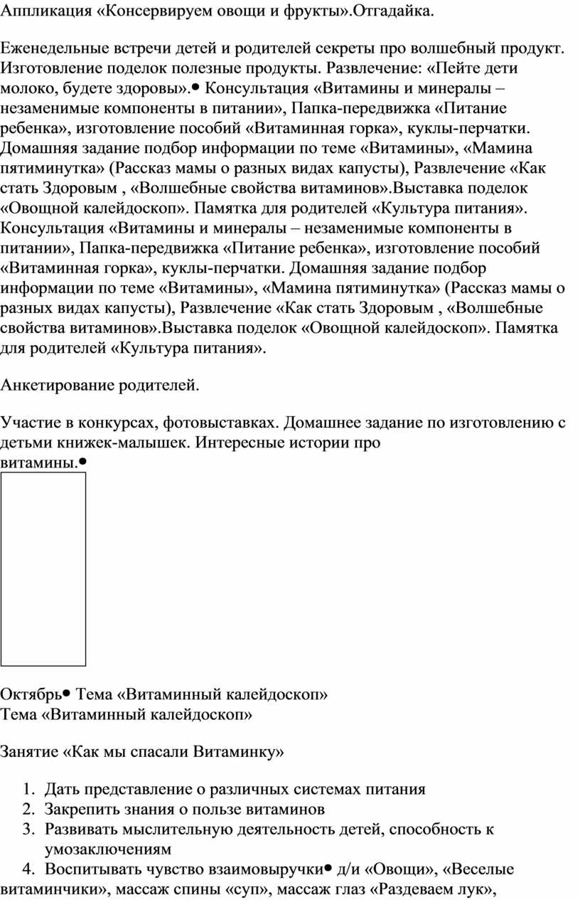 Родительское собрание «Здоровье ребенка в наших руках», Викторина с родителями «Витаминиада», совместное изготовление родителей и детей альбомов с информацией о витаминах и коллажей, папка-передвижка «Закаливание организма пищей», Памятка для родителей «Культура еды», презентация альбомов совместно с родителями с информацией о витаминах. Утренник «Осенины», ярмарка «Дары осени» |
