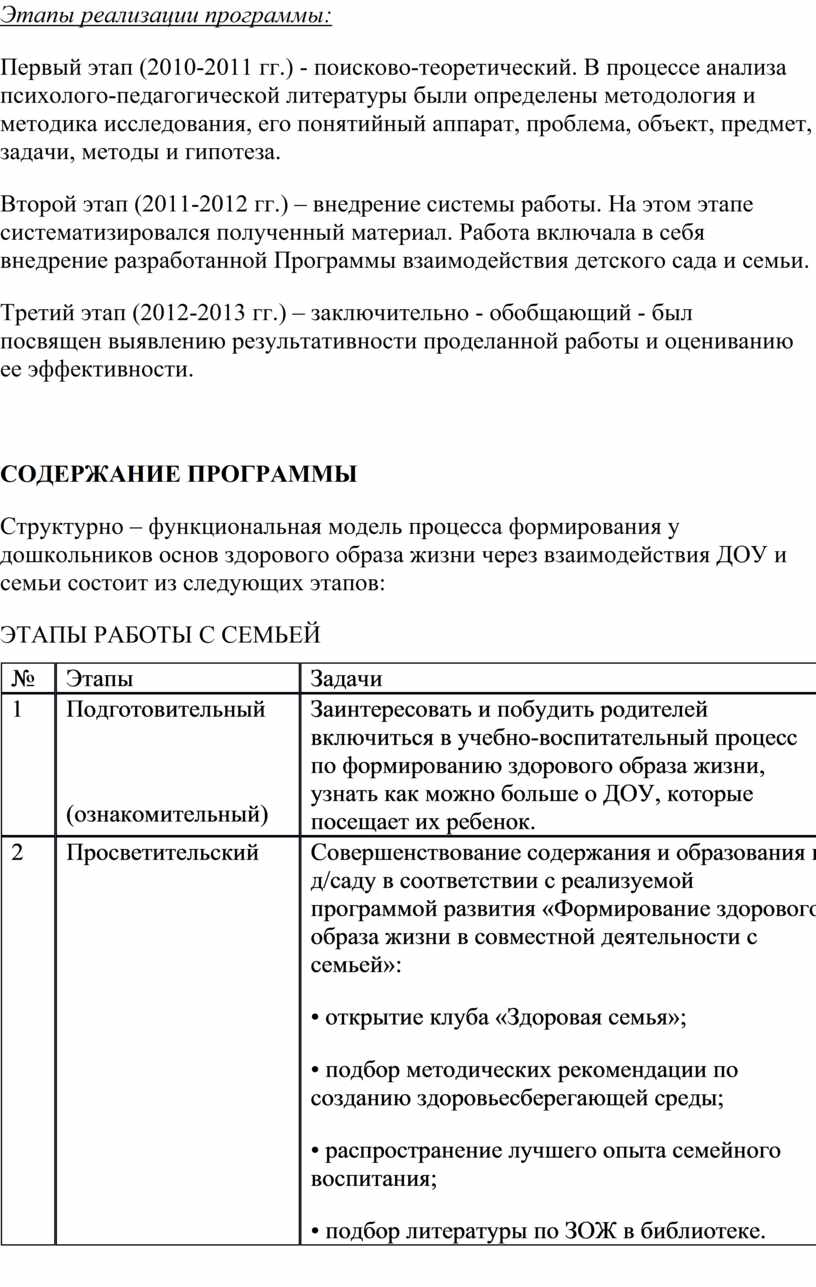 Второй этап (2011-2012 гг.) – внедрение системы работы. На этом этапе систематизировался полученный материал. Работа включала в себя внедрение разработанной Программы взаимодействия детского сада и семьи.
