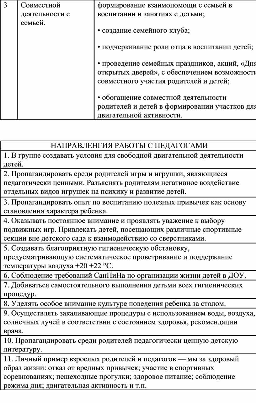 формирование взаимопомощи с семьей в воспитании и занятиях с детьми; • создание семейного клуба; • подчеркивание роли отца в воспитании детей; • проведение семейных праздников, акций, «Дня открытых дверей», с обеспечением возможности совместного участия родителей и детей; • обогащение совместной деятельности родителей и детей в формировании участков для двигательной активности. |