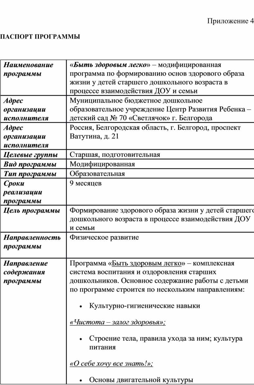 «Быть здоровым легко» – модифицированная программа по формированию основ здорового образа жизни у детей старшего дошкольного возраста в процессе взаимодействия ДОУ и семьи |