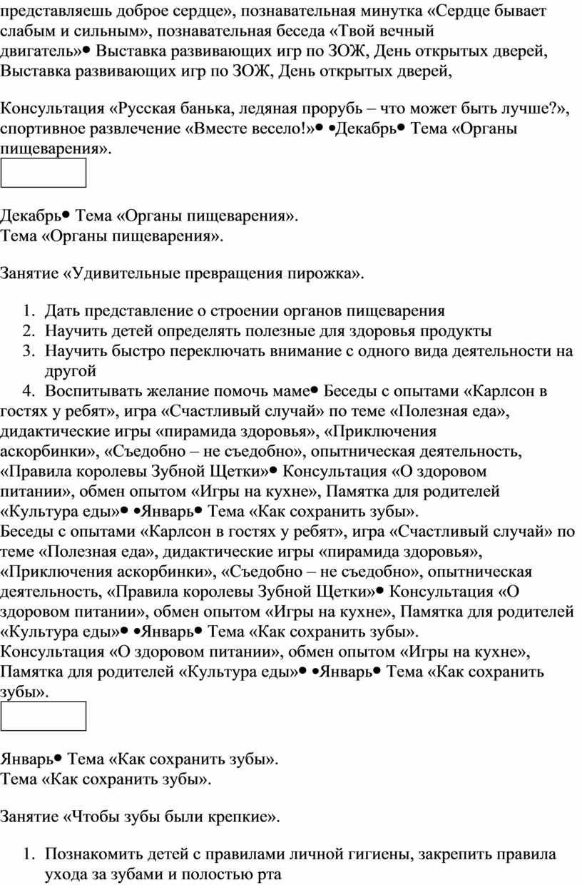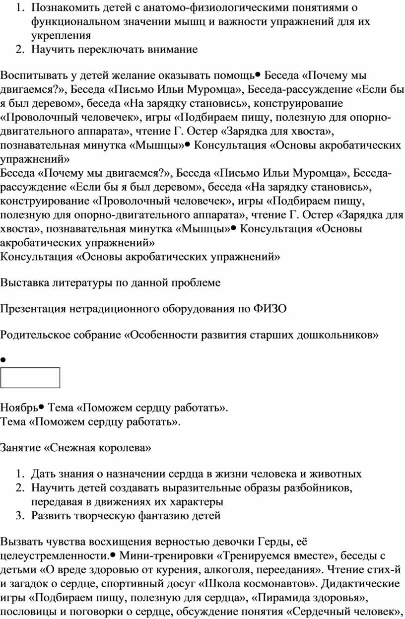 Мини-тренировки «Тренируемся вместе», беседы с детьми «О вреде здоровью от курения, алкоголя, переедания». Чтение стих-й и загадок о сердце, спортивный досуг «Школа космонавтов». Дидактические игры «Подбираем пищу, полезную для сердца», «Пирамида здоровья», пословицы и поговорки о сердце, обсуждение понятия «Сердечный человек», придумай загадку используя опорные картинки. ИЗО «Как ты представляешь доброе сердце», познавательная минутка «Сердце бывает слабым и сильным», познавательная беседа «Твой вечный двигатель» |