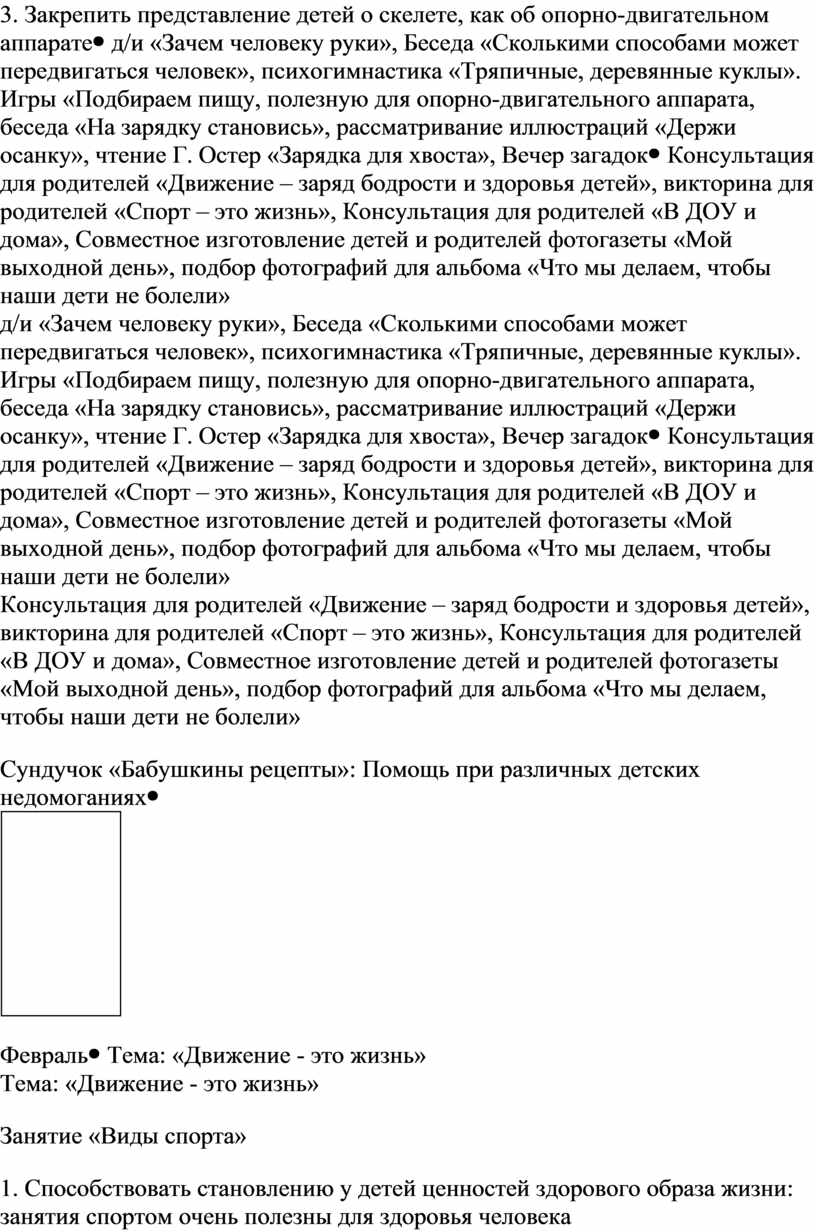 Консультация для родителей «Движение – заряд бодрости и здоровья детей», викторина для родителей «Спорт – это жизнь», Консультация для родителей «В ДОУ и дома», Совместное изготовление детей и родителей фотогазеты «Мой выходной день», подбор фотографий для альбома «Что мы делаем, чтобы наши дети не болели» Сундучок «Бабушкины рецепты»: Помощь при различных детских недомоганиях |