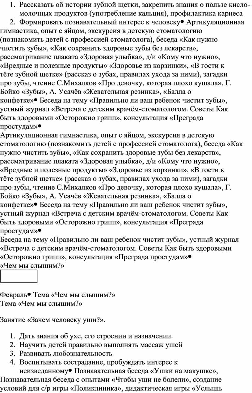 Артикуляционная гимнастика, опыт с яйцом, экскурсия в детскую стоматологию (познакомить детей с профессией стоматолога), беседа «Как нужно чистить зубы», «Как сохранить здоровые зубы без лекарств», рассматривание плаката «Здоровая улыбка», д/и «Кому что нужно», «Вредные и полезные продукты» «Здоровье из корзинки», «В гости к тёте зубной щетке» (рассказ о зубах, правилах ухода за ними), загадки про зубы, чтение С.Михалков «Про девочку, которая плохо кушала», Г. Бойко «Зубы», А. Усачёв «Жевательная резинка», «Балла о конфетке» |