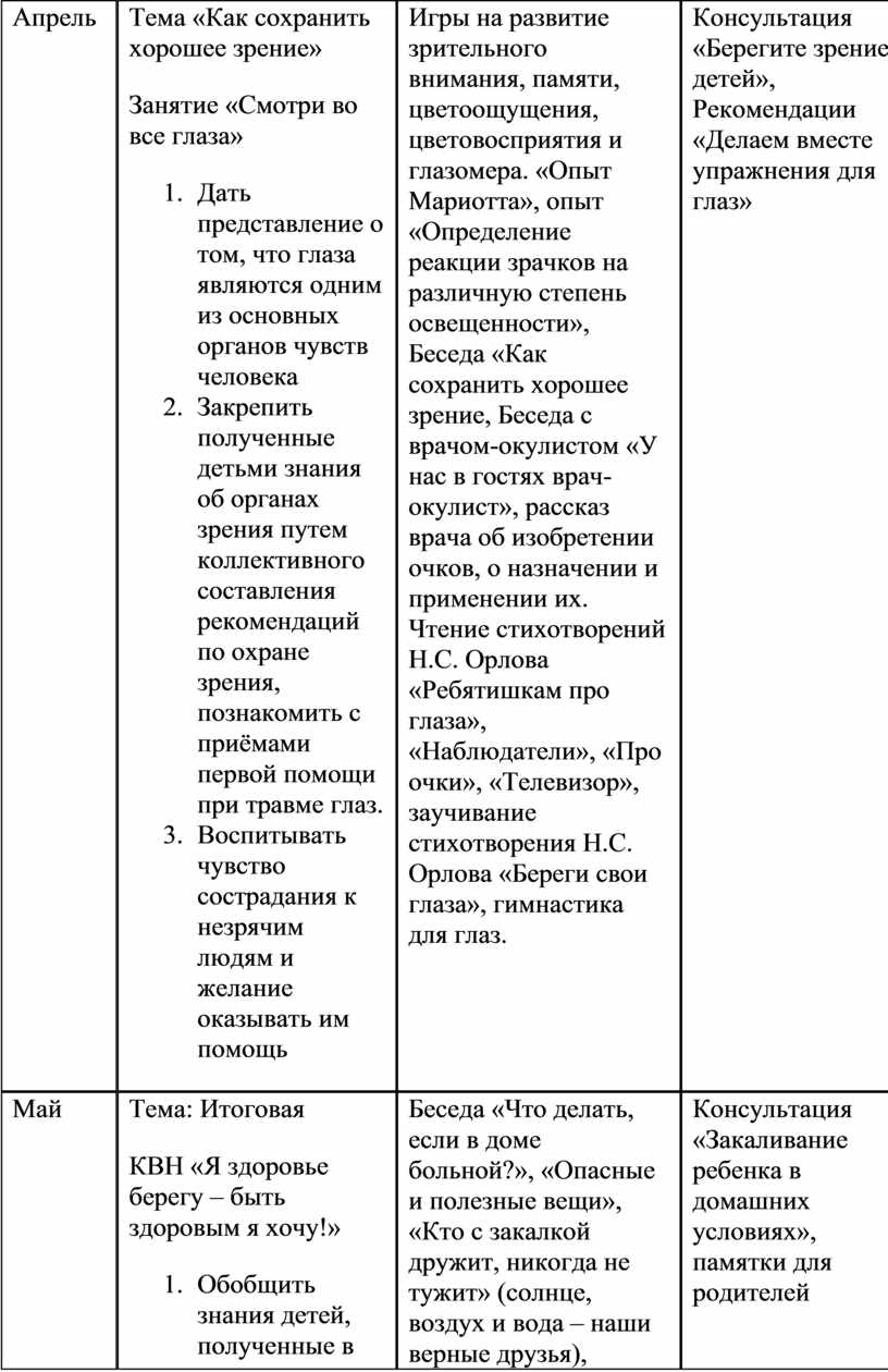 Игры на развитие зрительного внимания, памяти, цветоощущения, цветовосприятия и глазомера. «Опыт Мариотта», опыт «Определение реакции зрачков на различную степень освещенности», Беседа «Как сохранить хорошее зрение, Беседа с врачом-окулистом «У нас в гостях врач-окулист», рассказ врача об изобретении очков, о назначении и применении их. Чтение стихотворений Н.С. Орлова «Ребятишкам про глаза», «Наблюдатели», «Про очки», «Телевизор», заучивание стихотворения Н.С. Орлова «Береги свои глаза», гимнастика для глаз. |