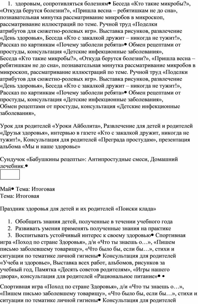 Беседа «Кто такие микробы?», «Откуда берутся болезни?», «Пришла весна – ребятишкам не до сна», познавательная минутка рассматривание микробов в микроскоп, рассматривание иллюстраций по теме. Ручной труд «Поделки атрибутов для сюжетно-ролевых игр». Выставка рисунков, развлечение «День здоровья», Беседа «Кто с закалкой дружит – никогда не тужит!», Рассказ по картинкам «Почему заболели ребята» |