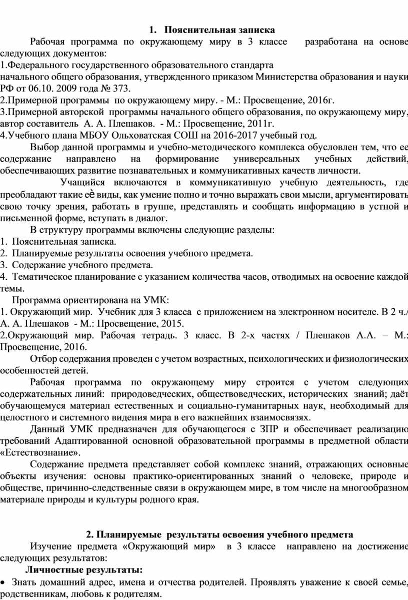 Рабочая программа по окружающему миру в 3 классе разработана на основе следующих документов: