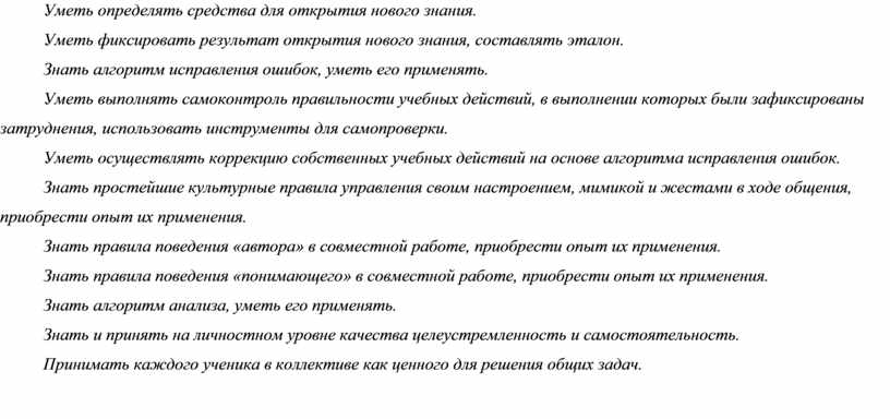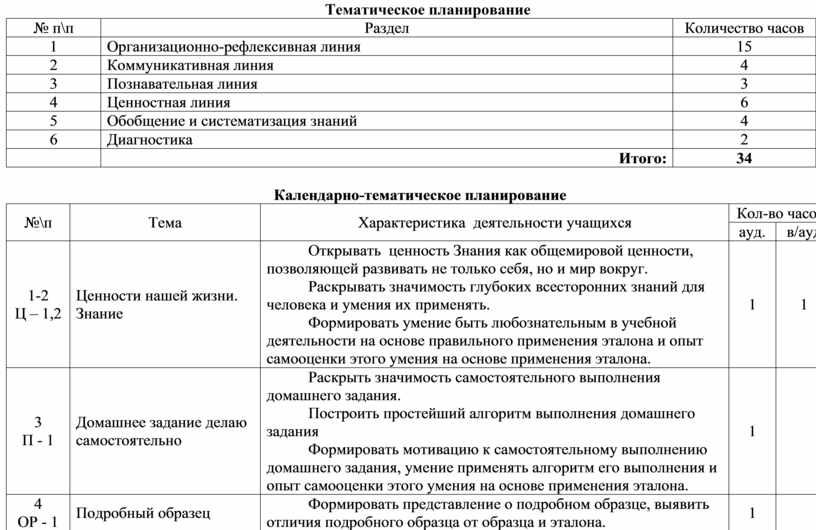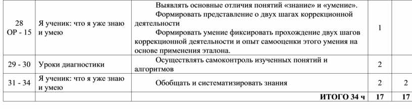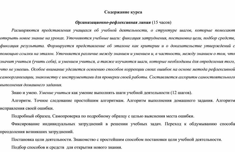 Расширяются представления учащихся об учебной деятельности, о структуре шагов, которые помогают открыть новое знание на уроках. Уточняются учебные шаги: фиксация затруднения, постановка цели, подбор средств, фиксация результата. Формируется представление об эталоне как критерии и о доказательстве утверждений с помощью ссылки на эталон. Уточняется различие между знанием и умением и, в частности, между знанием о том, что значит учиться (учить себя), и умением учиться, а также изучаются шаги, которые необходимы для определения того, что не умеешь. Особое внимание уделяется освоению способов коррекции своих ошибок на основе метода рефлексивной самоорганизации, знакомству с инструментами для проверки своей работы. Составляется алгоритм самостоятельного выполнения домашнего задания.