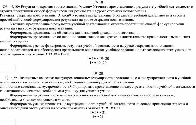 Уточнять представление о результате учебной деятельности и строить простейший способ формулирования результата на уроке открытия нового знания. Формировать представление об эталоне как о знаковой фиксации нового знания. Формировать представление об использовании эталона как критерия доказательства правильности выполнения учебного задания. Формировать умение фиксировать результат учебной деятельности на уроке открытия нового знания, использовать эталон для обоснования правильности выполнения учебного задания и опыт самооценки этих умений на основе применения эталона. |