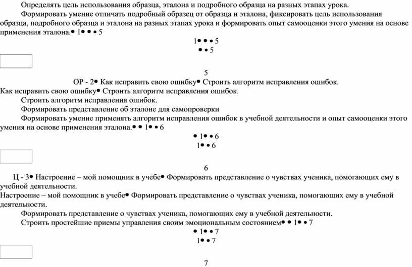 Формировать представление о подробном образце, выявить отличия подробного образца от образца и эталона. Определять цель использования образца, эталона и подробного образца на разных этапах урока. Формировать умение отличать подробный образец от образца и эталона, фиксировать цель использования образца, подробного образца и эталона на разных этапах урока и формировать опыт самооценки этого умения на основе применения эталона. |