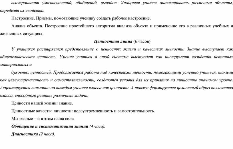 Учащиеся получают представление о рабочем настрое ученика, учатся применять простейшие приемы создания рабочего настроения на уроке. Начинается знакомство с мыслительными операциями, необходимыми для выстраивания умозаключений, обобщений, выводов. Учащиеся учатся анализировать различные объекты, определяя их свойства.