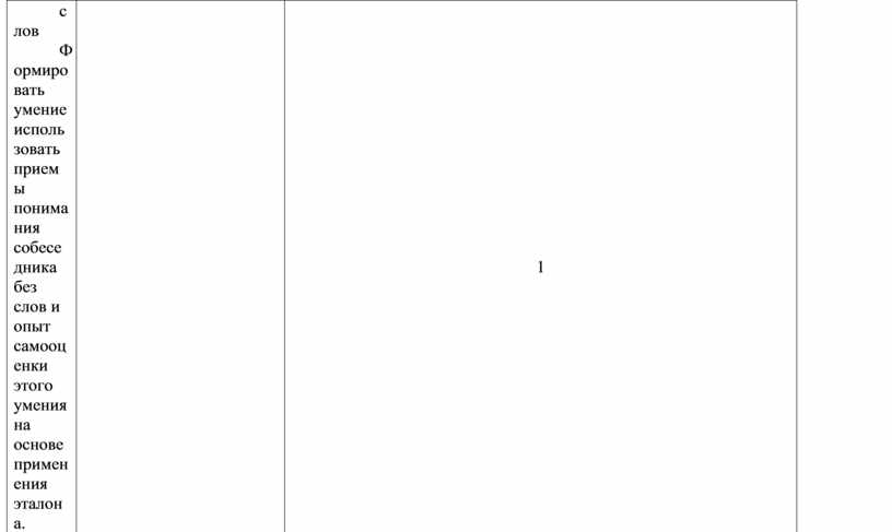 Формировать представление о необходимости понимать друг друга в процессе общения. Строить простейшие приемы понимания собеседника без слов Формировать умение использовать приемы понимания собеседника без слов и опыт самооценки этого умения на основе применения эталона. |