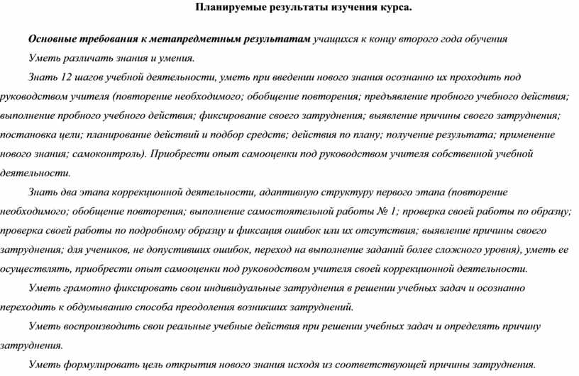 Знать два этапа коррекционной деятельности, адаптивную структуру первого этапа (повторение необходимого; обобщение повторения; выполнение самостоятельной работы № 1; проверка своей работы по образцу; проверка своей работы по подробному образцу и фиксация ошибок или их отсутствия; выявление причины своего затруднения; для учеников, не допустивших ошибок, переход на выполнение заданий более сложного уровня), уметь ее осуществлять, приобрести опыт самооценки под руководством учителя своей коррекционной деятельности.