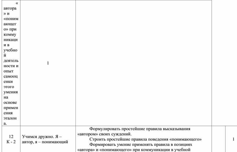 Формулировать простейшие правила высказывания «автором» своих суждений. Строить простейшие правила поведения «понимающего» Формировать умение применять правила в позициях «автора» и «понимающего» при коммуникации в учебной деятельности и опыт самооценки этого умения на основе применения эталона. |