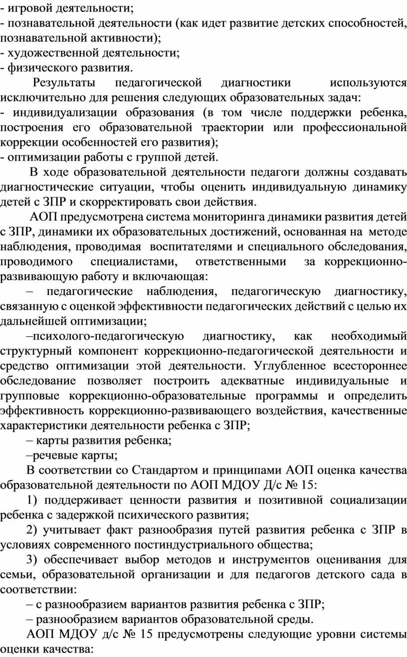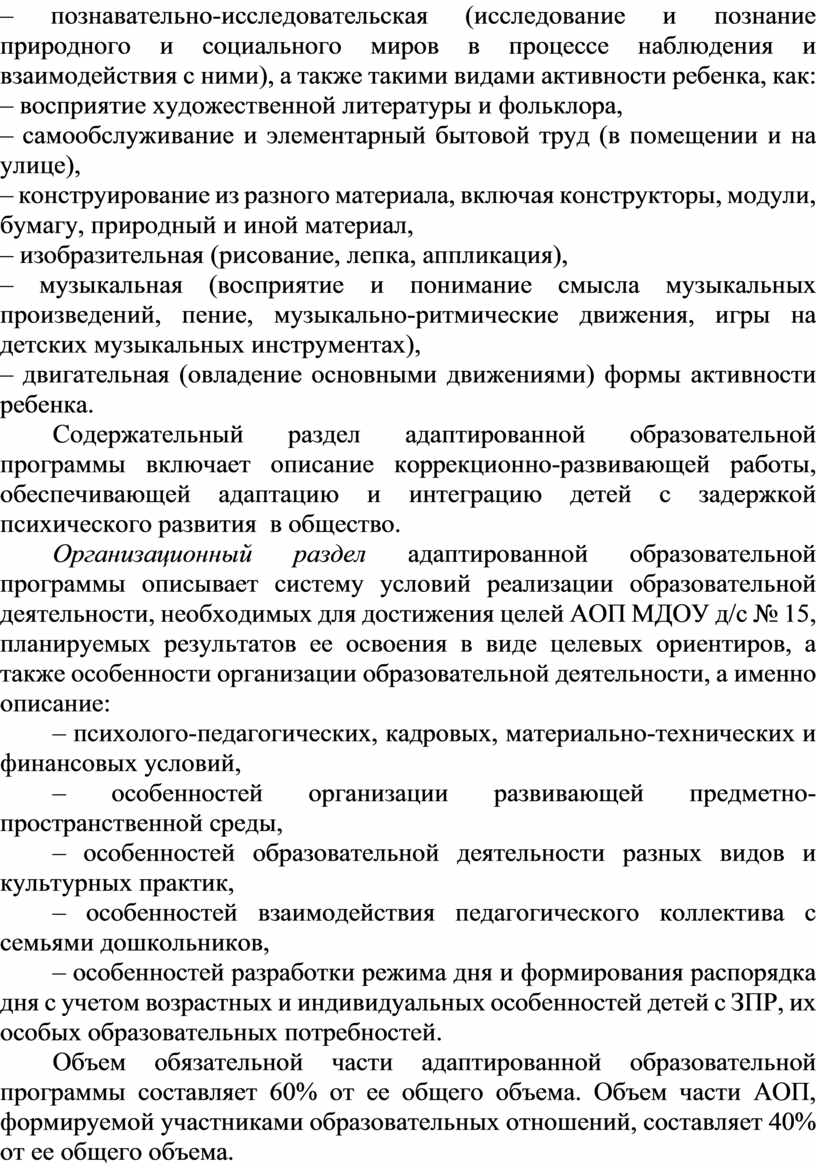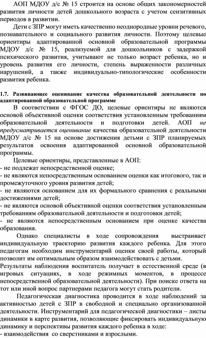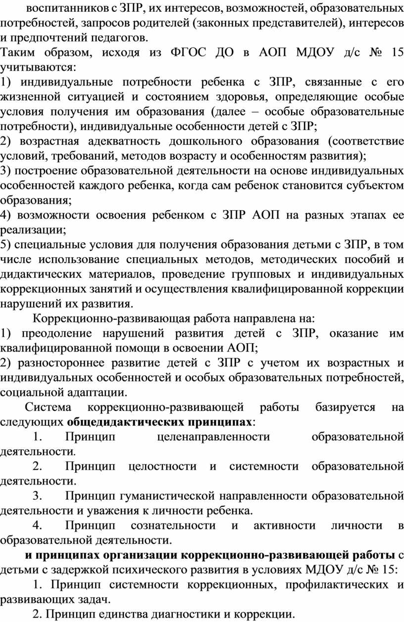 АОП МДОУ д/с № 15 обеспечивает образовательную деятельность в разновозрастной группе компенсирующей направленности для детей с задержкой психического развития с учетом особенностей их психофизического развития и индивидуальных возможностей по образовательным областям, соответствующим Федеральному государственному образовательному стандарту дошкольного образования.