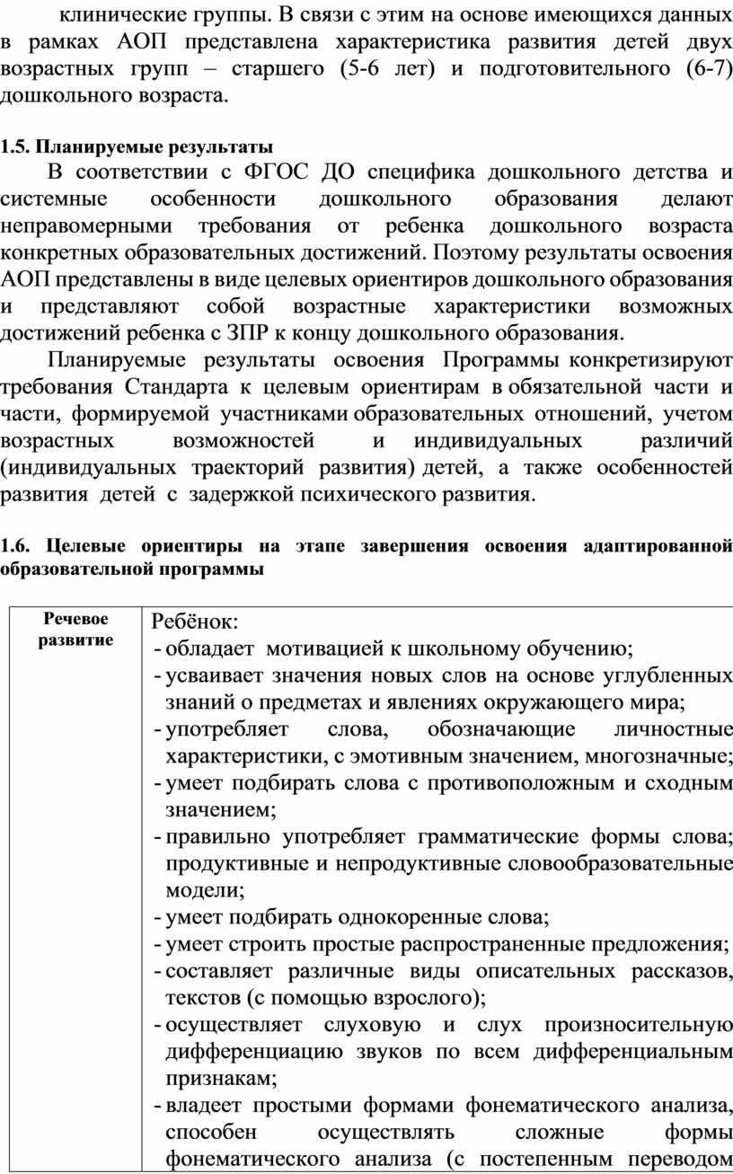 1.1.1. Цели и задачи адаптированной образовательной программы для дошкольников с задержкой психического развития.
