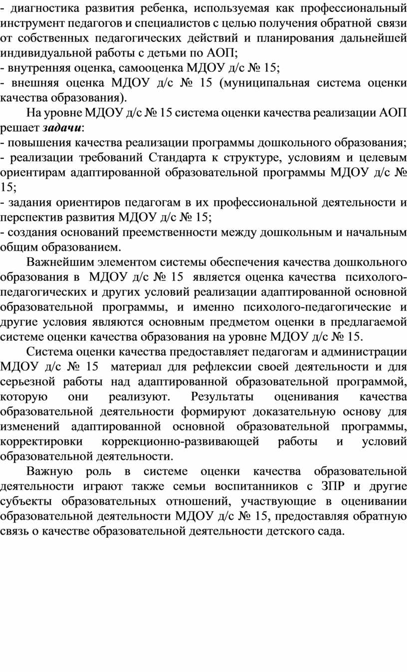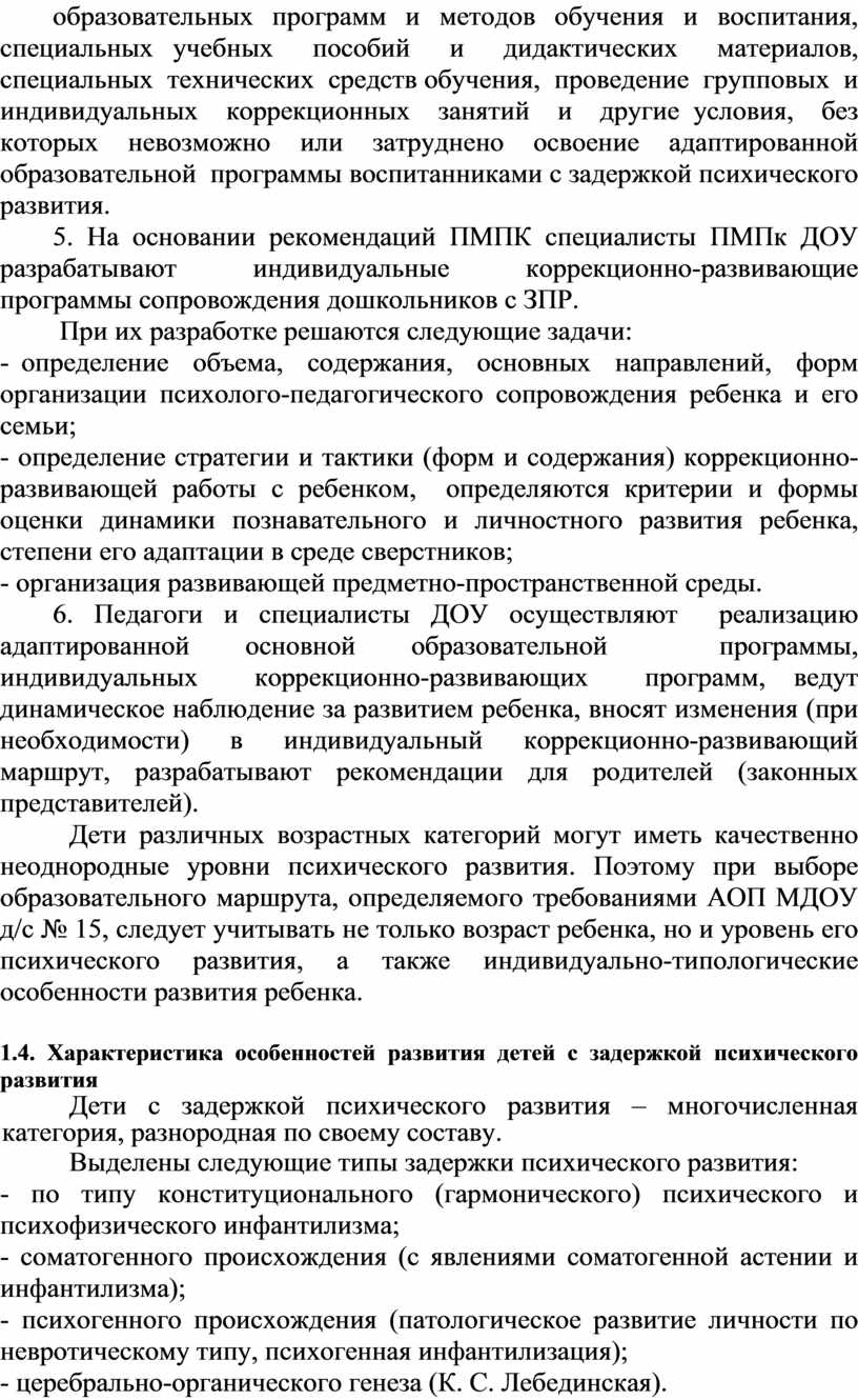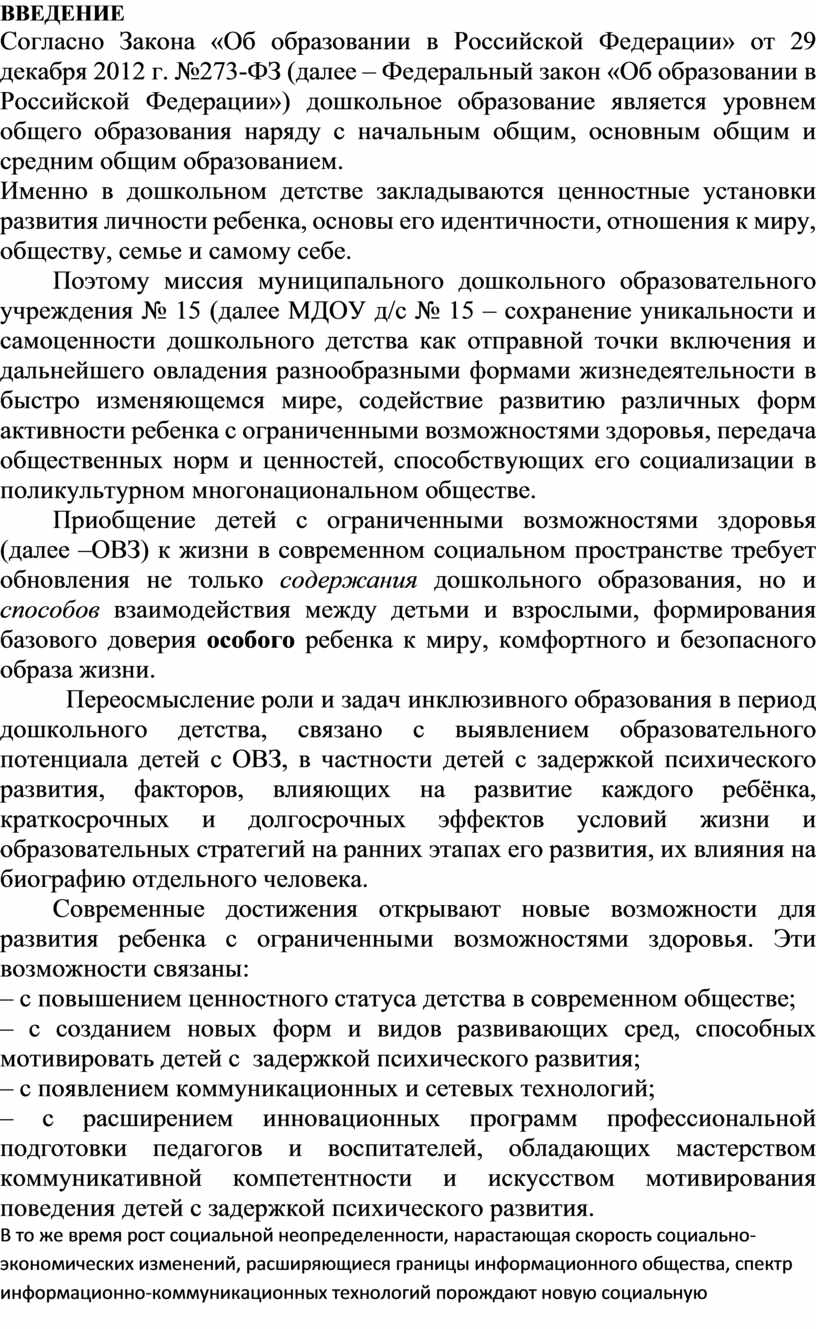 С учетом культурно-исторических особенностей современного общества, вызовов неопределенности и сложности изменяющегося мира и обозначенных выше рисков для полноценного развития и безопасности детей с ограниченными возможностями здоровья, в соответствии с Федеральным законом «Об образовании в Российской Федерации» и Федеральным государственным образовательным стандартом дошкольного образования (далее – ФГОС ДО, Стандарт), разработана адаптированная образовательная программа для дошкольников с задержкой психического развития (далее ЗПР) муниципального дошкольного образовательного учреждения № 15 (далее – АОП МДОУ д/с № 15).