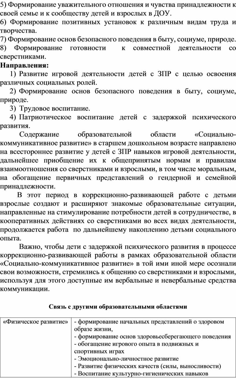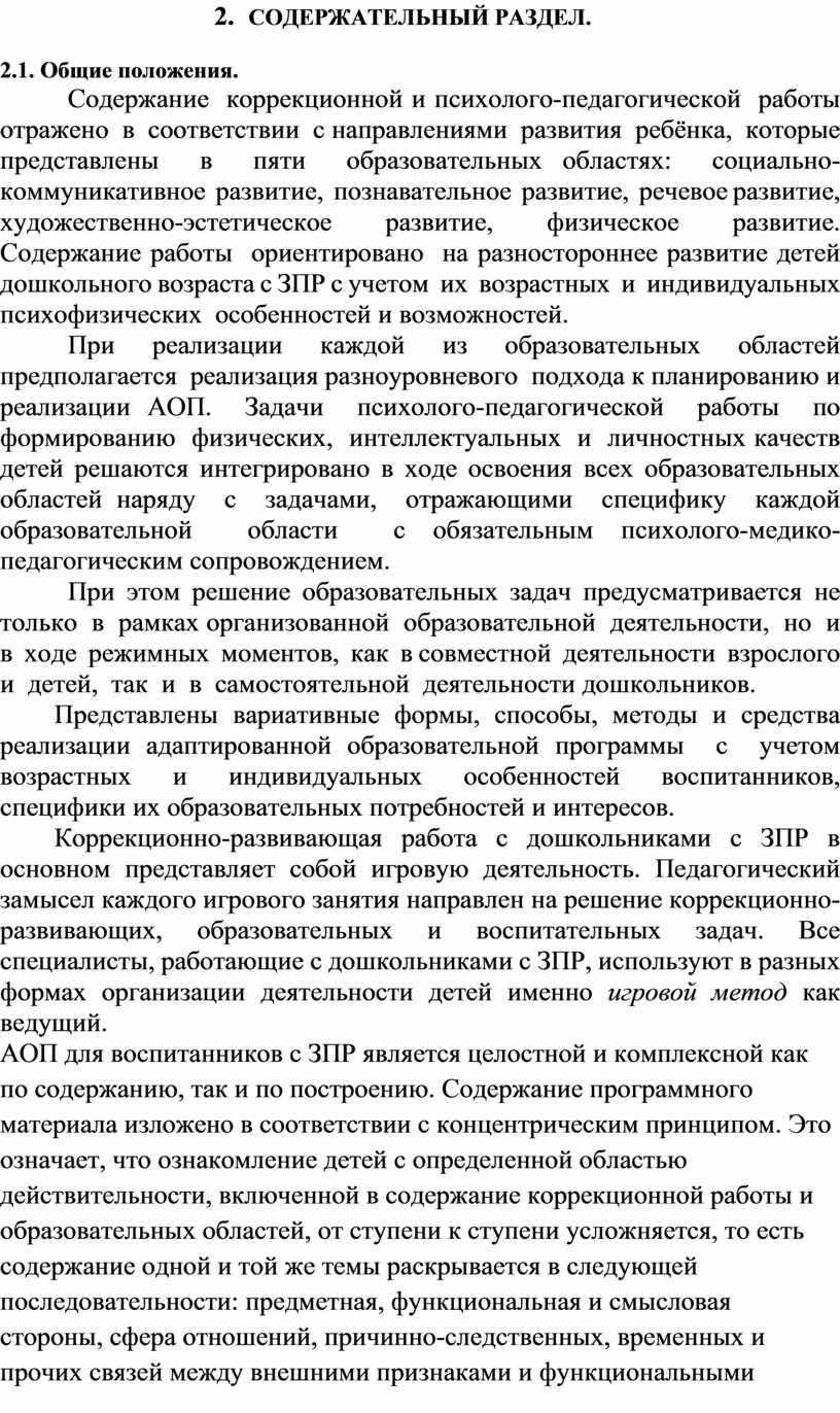 Содержательный раздел адаптированной образовательной программы включает описание образовательной деятельности в соответствии с направлениями развития ребенка с ЗПР в пяти образовательных областях – социально-коммуникативной, познавательной, речевой, художественно-эстетической, физической.