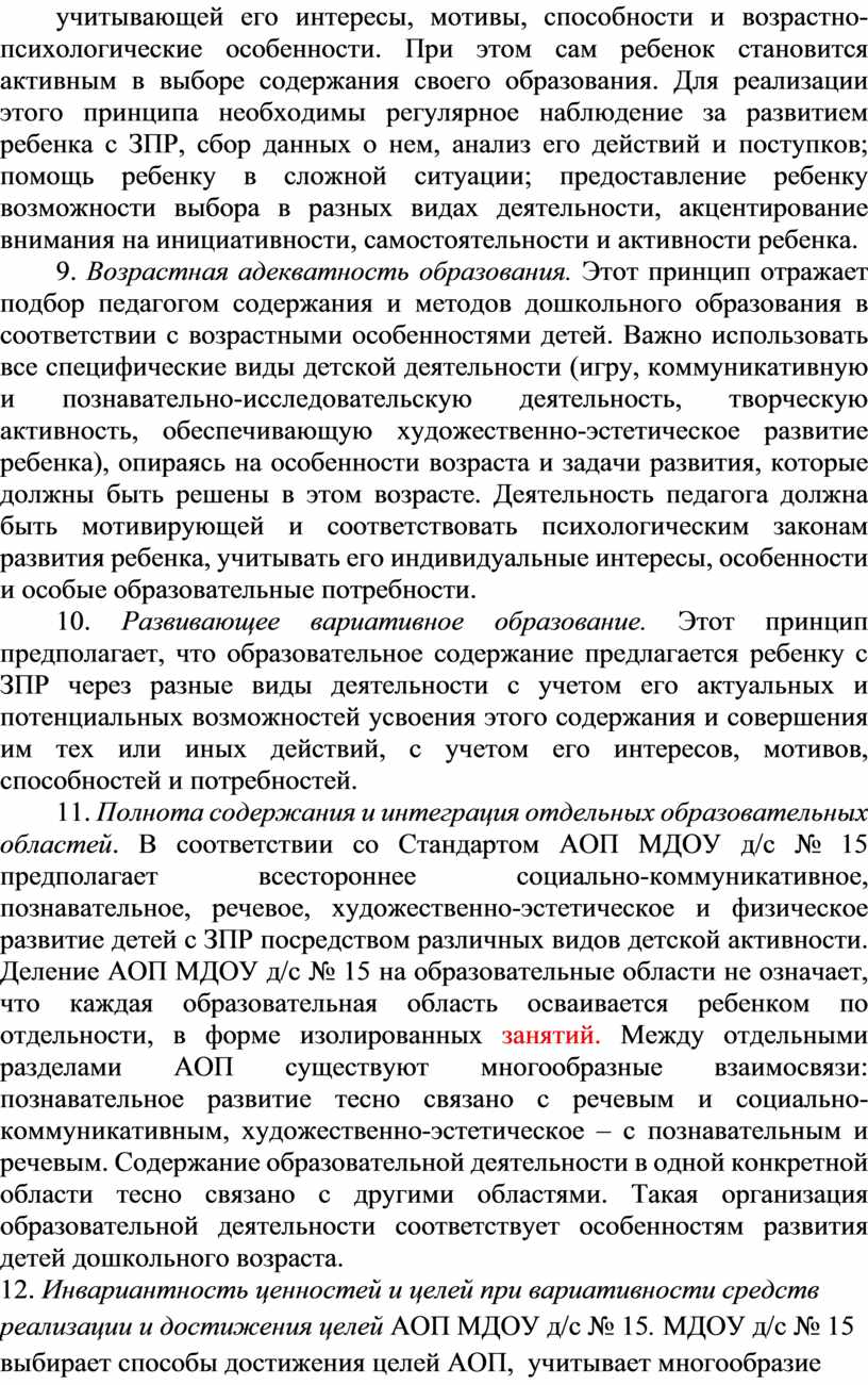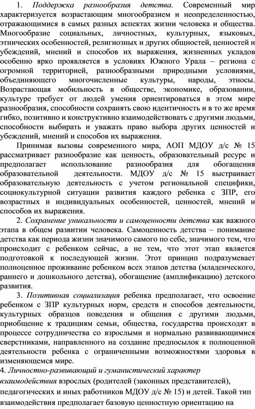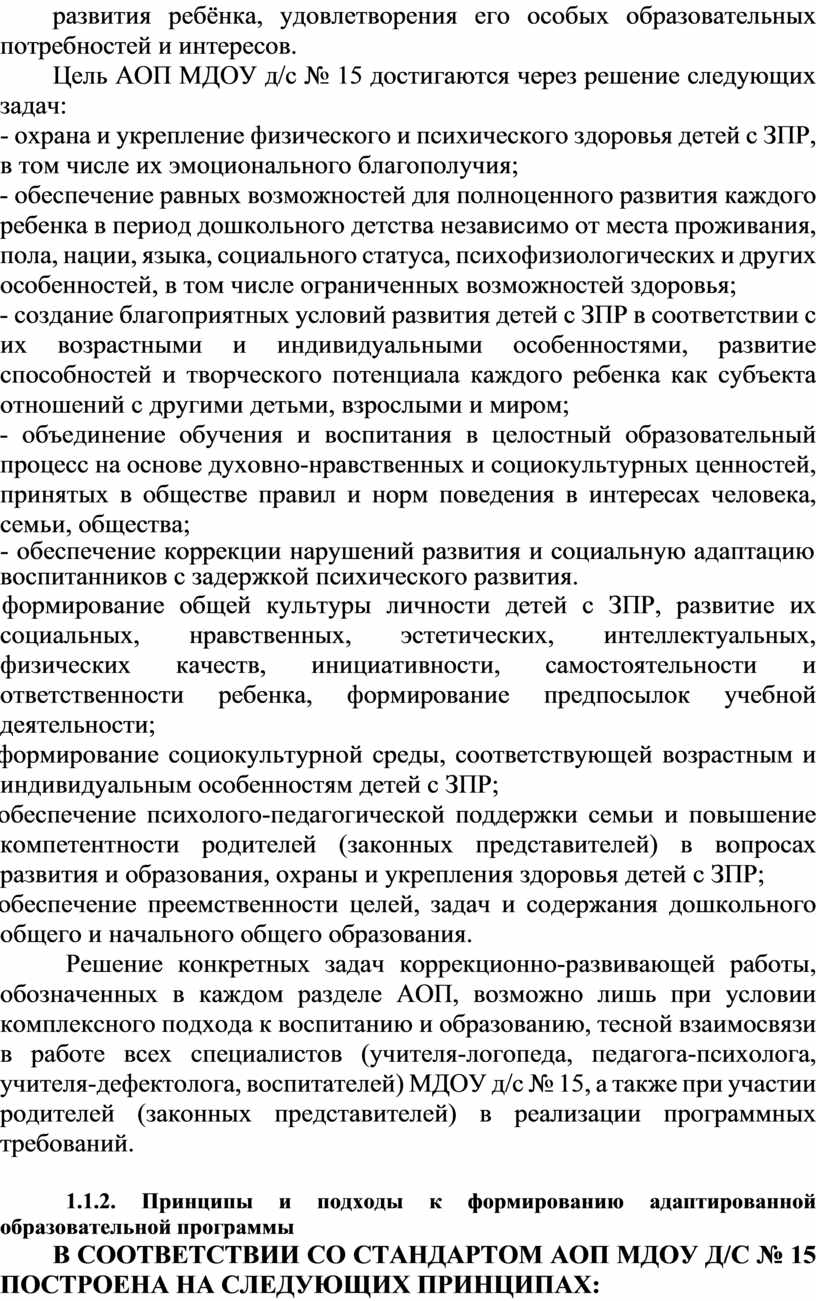 АОП МДОУ д/с № 15, в соответствии с Федеральным законом «Об образовании в Российской Федерации», содействует взаимопониманию и сотрудничеству между людьми, учитывает разнообразие мировоззренческих подходов, способствует реализации права детей с ЗПР на свободный выбор мнений и убеждений, обеспечивает развитие способностей каждого ребенка, формирование и развитие личности ребенка в соответствии с принятыми в семье и обществе духовно-нравственными и социокультурными ценностями в целях интеллектуального, духовно-нравственного, творческого и физического развития ребёнка, удовлетворения его особых образовательных потребностей и интересов.