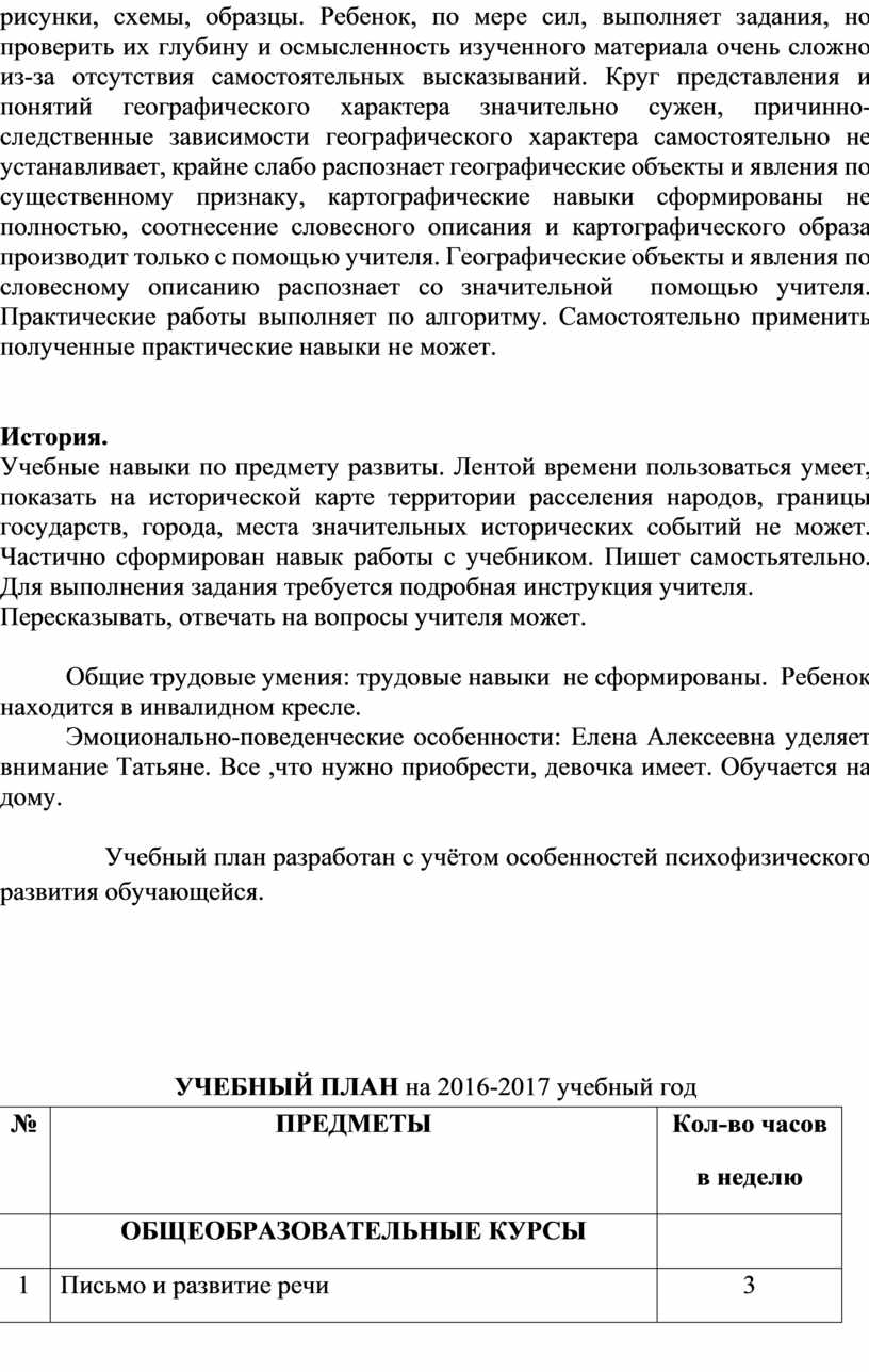 Учебный план разработан с учётом особенностей психофизического развития обучающейся.