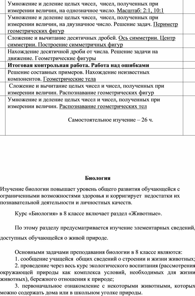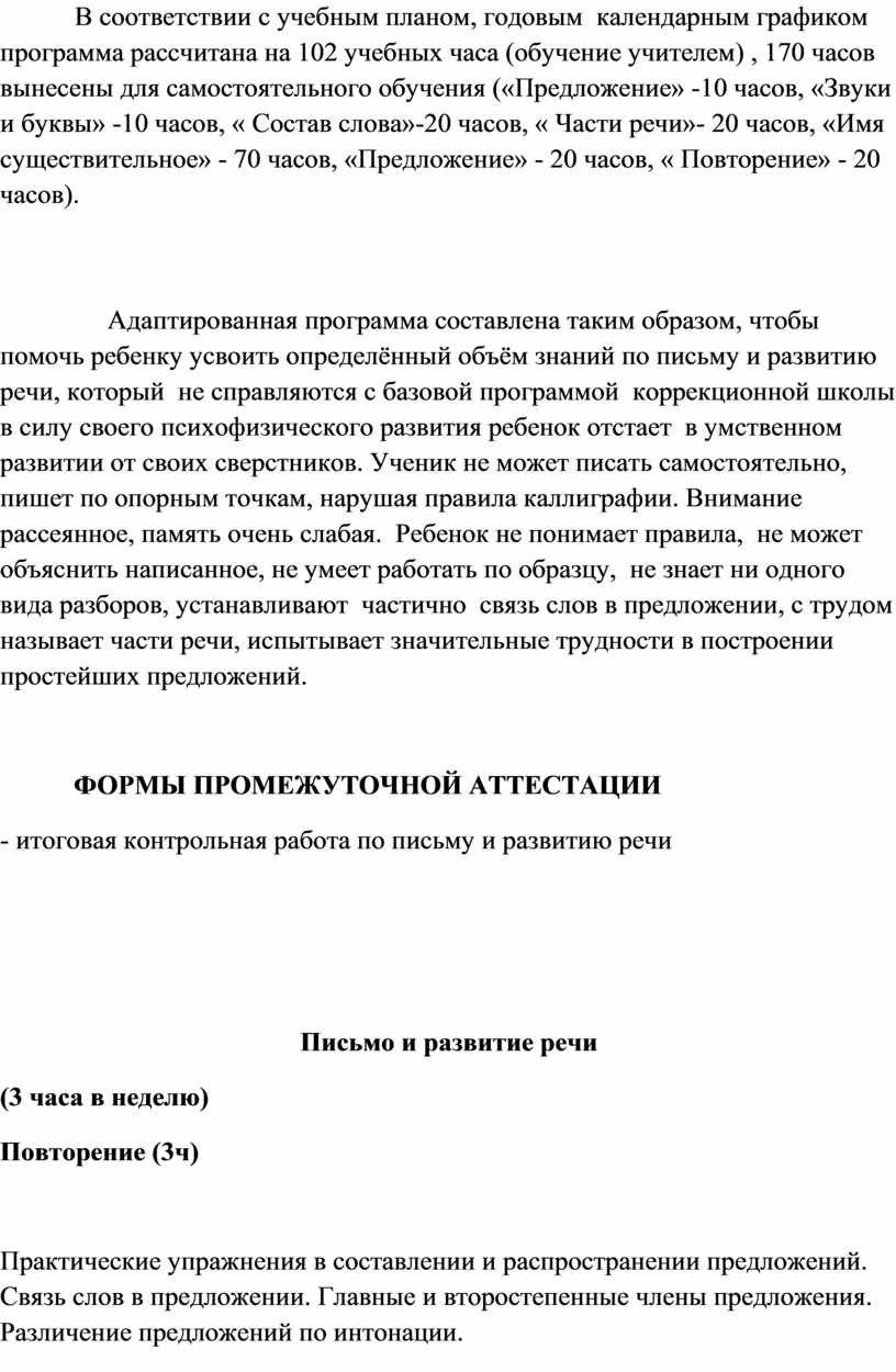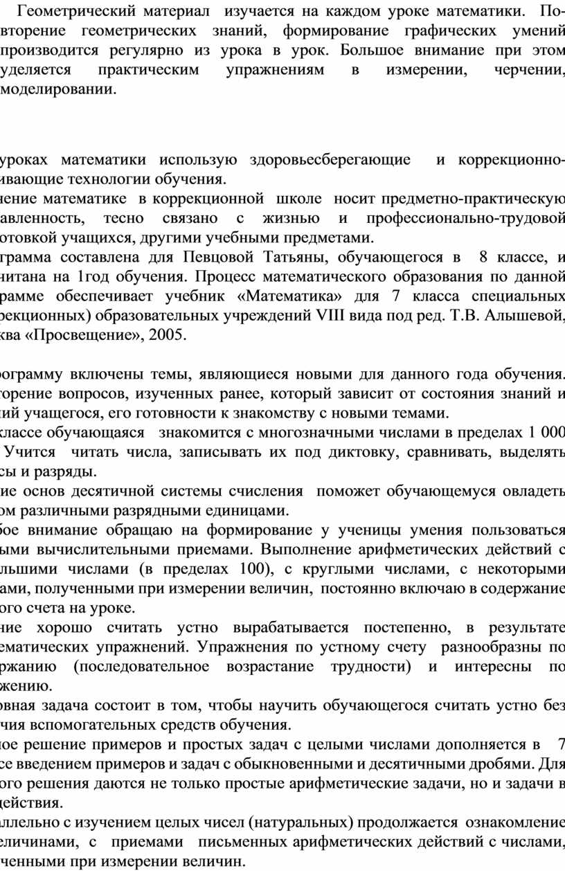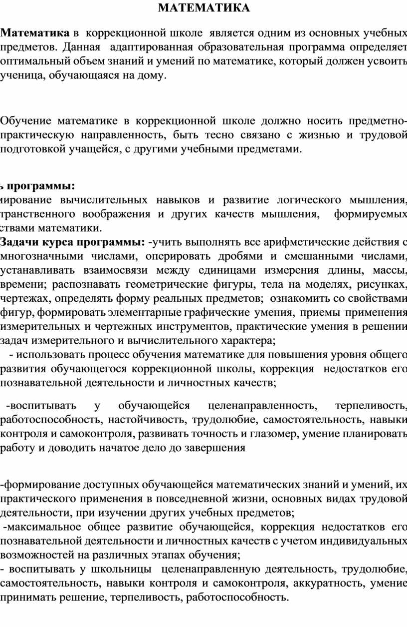 Данная программа представляет собой целостный документ, включающий: пояснительную записку; календарно-тематический план; перечень учебно-методического обеспечения. Программа является адаптированной. Программа детализирует и раскрывает содержание образования, определяет общую стратегию обучения, воспитания и развития обучающейся средствами учебного предмета в соответствии с целями изучения предметов, которые определены программой.
